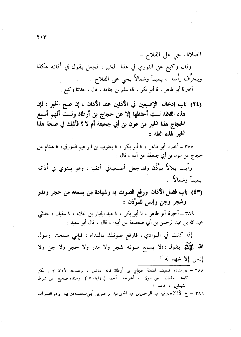 388 - نا يَعْقُوبُ بْنُ إِبْرَاهِيمَ الدَّوْرَقِيُّ، نا هِشَامٌ، عَنْ حَجَّاجٍ، عَنْ عَوْنِ بْنِ أَبِي جُحَيْفَةَ، عَنْ أَبِيهِ قَالَ: «§رَأَيْتُ بِلَالًا يُؤَذِّنُ، وَقَدْ جَعَلَ أُصْبُعَيهُ فِي أُذُنَيْهِ وَهُوَ يَلْتَوِي فِي أَذَانِهِ يَمِينًا وَشِمَالًا» K388 - قال الألباني: إسناده ضعيف لعنعنة حجاج بن أرطاة فإنه مدلس لكن تابعه سفيان عن عون أخرجه أحمد 4 / 307 وسنده صحيح على شرط الشيخين