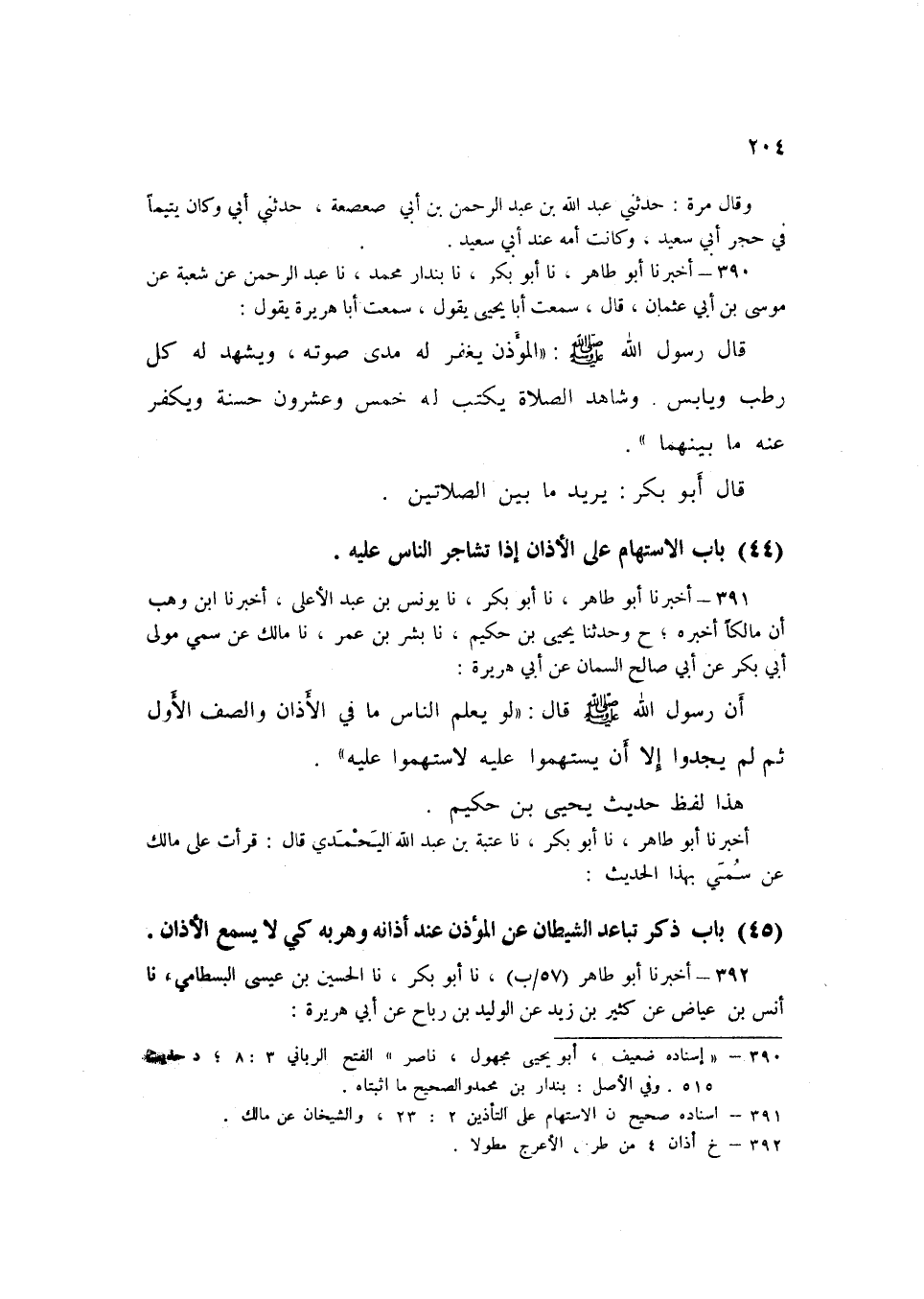 391 - نا يُونُسُ بْنُ عَبْدِ الْأَعْلَى، أَخْبَرَنَا ابْنُ وَهْبٍ، أَنَّ مَالِكًا، أَخْبَرَهُ، ح وَحَدَّثَنَا يَحْيَى بْنُ حَكِيمٍ، نا بِشْرُ بْنُ عُمَرَ، نا مَالِكٌ، عَنْ سُمَيٍّ، مَوْلَى أَبِي بَكْرٍ، عَنْ أَبِي صَالِحٍ السَّمَّانِ، عَنْ أَبِي هُرَيْرَةَ، أَنَّ رَسُولَ اللَّهِ صَلَّى اللهُ عَلَيْهِ وَسَلَّمَ قَالَ: «§لَوْ يَعْلَمُ النَّاسُ مَا فِي الْأَذَانِ وَالصَّفِّ الْأَوَّلِ، ثُمَّ لَمْ يَجِدُوا إِلَّا أَنْ يَسْتَهِمُوا عَلَيْهِ لَاسْتَهَمُوا عَلَيْهِ» هَذَا لَفْظُ حَدِيثِ يَحْيَى بْنِ حَكِيمٍ نا عُتْبَةُ بْنُ عَبْدِ اللَّهِ الْيَحْمَدِيُّ قَالَ: قَرَأْتُ عَلَى مَالِكٍ، عَنْ سُمَيٍّ بِهَذَا الْحَدِيثِK391 - قال الأعظمي: إسناده صحيح