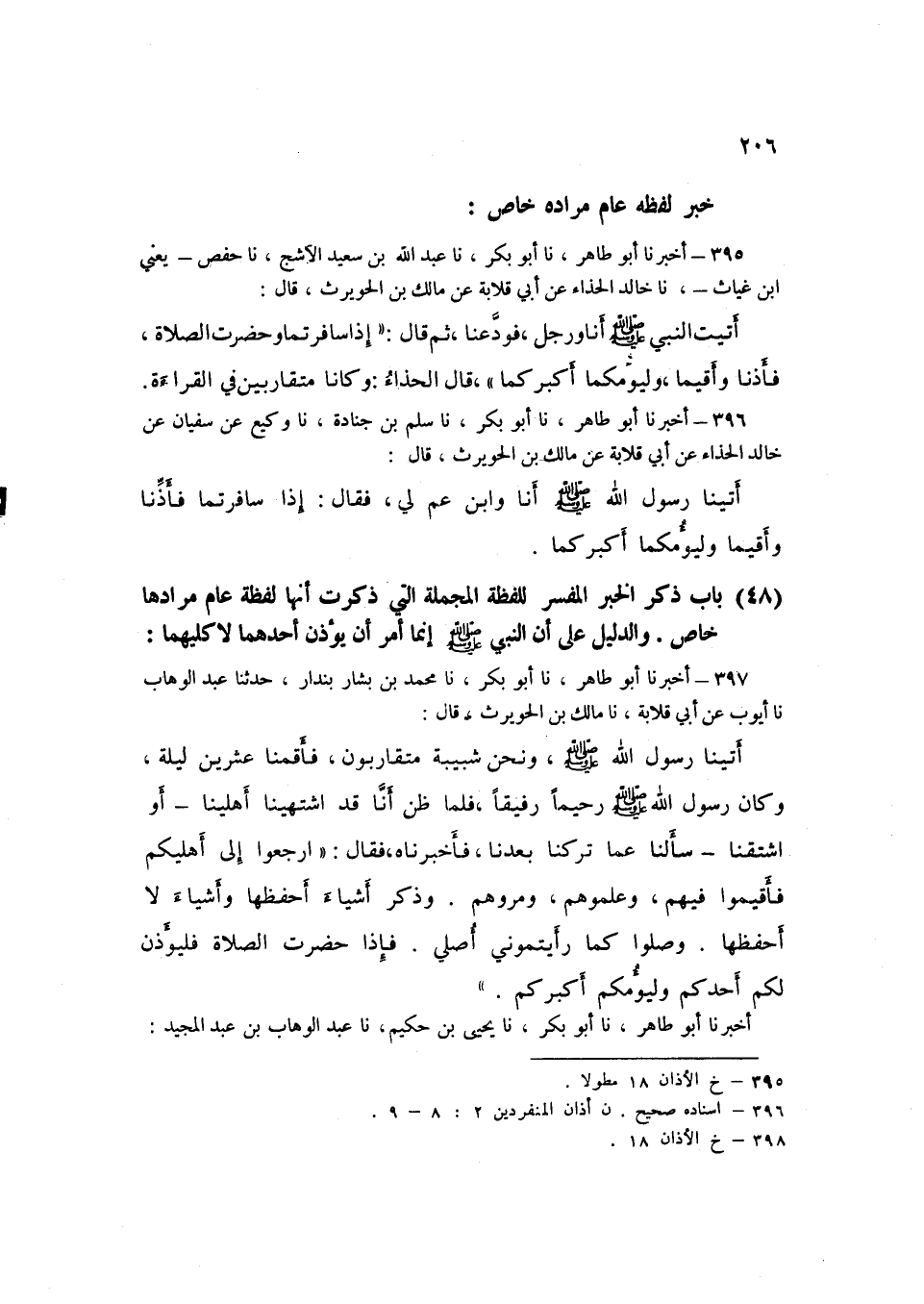 396 - نا سَلْمُ بْنُ جُنَادَةَ، نا وَكِيعٌ، عَنْ سُفْيَانَ، عَنْ خَالِدٍ الْحَذَّاءِ، عَنْ أَبِي قِلَابَةَ، عَنْ مَالِكِ بْنِ الْحُوَيْرِثِ قَالَ: أَتَيْنَا رَسُولَ اللَّهِ صَلَّى اللهُ عَلَيْهِ وَسَلَّمَ أَنَا وَابْنُ عَمٍّ لِي، فَقَالَ: «§إِذَا سَافَرْتُمَا فَأَذِّنَا وَأَقِيمَا وَلْيَؤُمَّكُمَا أَكْبَرُكُمَا» K396 - قال الأعظمي: إسناده صحيح