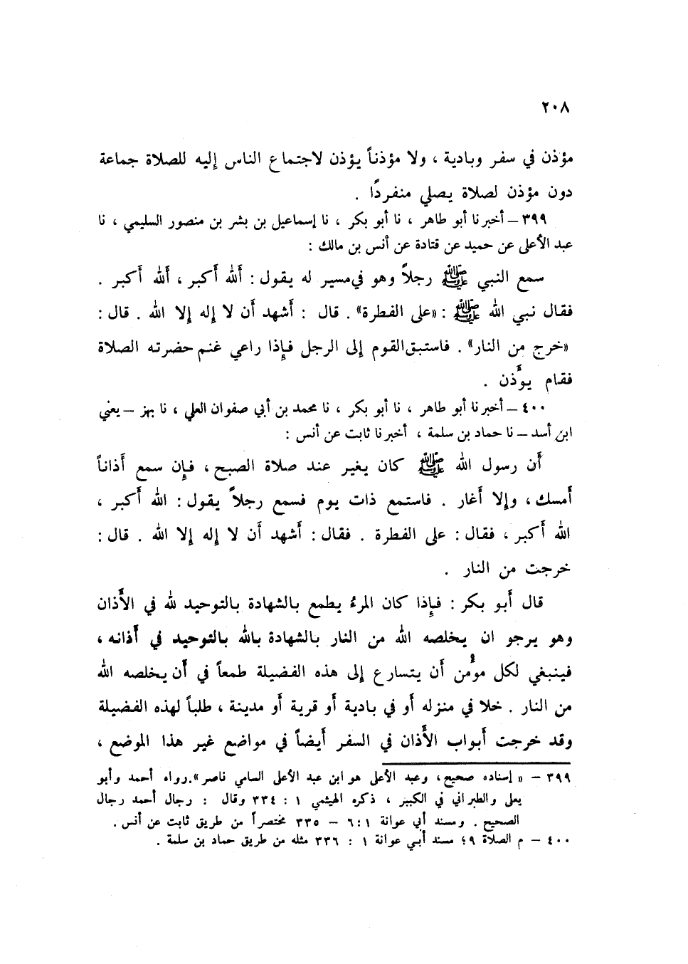400 - نا مُحَمَّدُ بْنُ أَبِي صَفْوَانَ الْعَلِيُّ، نا بَهْزٌ، يَعْنِي ابْنَ أَسَدٍ، نا حَمَّادُ بْنُ سَلَمَةَ، أَخْبَرَنَا ثَابِتٌ، عَنْ أَنَسٍ، أَنَّ رَسُولَ اللَّهِ صَلَّى اللهُ عَلَيْهِ وَسَلَّمَ كَانَ يُغِيرُ عِنْدَ صَلَاةِ الصُّبْحِ فَإِنْ §سَمِعَ أَذَانًا أَمْسَكَ وَإِلَّا أَغَارَ، فَاسْتَمَعَ ذَاتَ يَوْمٍ فَسَمِعَ رَجُلًا يَقُولُ: اللَّهُ أَكْبَرُ، اللَّهُ أَكْبَرُ، فَقَالَ: «عَلَى الْفِطْرَةِ» ، فَقَالَ: أَشْهَدُ أَنْ لَا إِلَهَ إِلَّا اللَّهُ قَالَ: «خَرَجْتَ مِنَ النَّارِ» قَالَ أَبُو بَكْرٍ: فَإِذَا كَانَ الْمَرْءُ يَطْمَعُ بِالشَّهَادَةِ بِالتَّوْحِيدِ لِلَّهِ فِي الْأَذَانِ وَهُوَ يَرْجُو أَنْ يُخَلِّصَهُ اللَّهُ مِنَ النَّارِ بِالشَّهَادَةِ بِاللَّهِ بِالتَّوْحِيدِ فِي أَذَانِهِ فَيَنْبَغِي لِكُلِّ مُؤْمِنٍ أَنْ يَتَسَارَعَ إِلَى هَذِهِ الْفَضِيلَةِ طَمَعًا فِي أَنْ يُخَلِّصَهُ اللَّهُ مِنَ النَّارِ، خَلَا فِي مَنْزِلِهِ أَوْ فِي بَادِيَةٍ أَوْ قَرْيَةٍ أَوْ مَدِينَةٍ طَلَبًا لِهَذِهِ الْفَضِيلَةِ، وَقَدْ خَرَّجْتُ أَبْوَابَ الْأَذَانِ فِي السَّفَرِ أَيْضًا فِي مَوَاضِعَ غَيْرِ هَذَا الْمَوْضِعِ فِي نَوْمِ النَّبِيِّ صَلَّى اللهُ عَلَيْهِ وَسَلَّمَ عَنْ صَلَاةِ الصُّبْحِ حَتَّى طَلَعَتِ الشَّمْسُ، وَأَمْرُهُ صَلَّى اللهُ عَلَيْهِ وَسَلَّمَ بِلَالًا بِالْأَذَانِ لِلصُّبْحِ بَعْدَ ذَهَابِ وَقْتِ تِلْكَ الصَّلَاةِ، وَتِلْكَ الْأَخْبَارُ أَيْضًا خِلَافُ قَوْلِ مَنْ زَعَمَ أَنْ لَا يُؤَذَّنَ لِلصَّلَاةِ بَعْدَ ذَهَابِ وَقْتِهَا، وَإِنَّمَا يُقَامُ لَهَا بِغَيْرِ أَذَانٍ