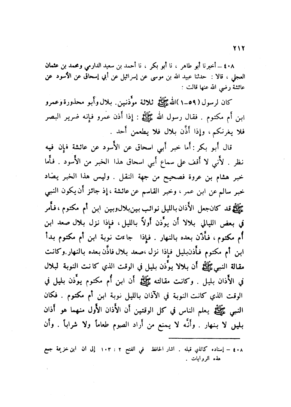 408 - نا أَحْمَدُ بْنُ سَعِيدٍ الدَّارِمِيُّ، وَمُحَمَّدُ بْنُ عُثْمَانَ الْعِجْلِيُّ قَالَا: حَدَّثَنَا عُبَيْدُ اللَّهِ بْنُ مُوسَى، عَنْ إِسْرَائِيلَ، عَنْ أَبِي إِسْحَاقَ، عَنِ الْأَسْوَدِ، عَنْ عَائِشَةَ رَضِي اللَّهُ عَنْهَا قَالَتْ: كَانَ لِرَسُولِ اللَّهِ صَلَّى اللهُ عَلَيْهِ وَسَلَّمَ ثَلَاثَةُ مُؤَذِّنِينَ بِلَالٌ وَأَبُو مَحْذُورَةَ وَعَمْرُو بْنُ أُمِّ مَكْتُومٍ، فَقَالَ رَسُولُ اللَّهِ صَلَّى اللهُ عَلَيْهِ وَسَلَّمَ: «§إِذَا أَذَّنَ عَمْرٌو فَإِنَّهُ ضَرِيرُ الْبَصَرِ فَلَا يَغُرَّنَّكُمْ، وَإِذَا أَذَّنَ بِلَالٌ فَلَا يَطْعَمَنَّ أَحَدٌ» قَالَ أَبُو بَكْرٍ: أَمَّا خَبَرُ أَبِي إِسْحَاقَ، عَنِ الْأَسْوَدِ، عَنْ عَائِشَةَ فَإِنَّ فِيهِ نَظَرًا؛ لِأَنِّي لَا أَقِفُ عَلَى سَمَاعِ أَبِي إِسْحَاقَ هَذَا الْخَبَرَ مِنَ الْأَسْوَدِ، فَأَمَّا خَبَرُ هِشَامِ بْنِ عُرْوَةَ فَصَحِيحٌ مِنْ جِهَةِ النَّقْلِ، وَلَيْسَ هَذَا الْخَبَرُ يُضَادُّ خَبَرَ سَالِمٍ عَنِ ابْنِ عُمَرَ، وَخَبَرَ الْقَاسِمِ عَنْ عَائِشَةَ، إِذْ جَائِزٌ أَنْ يَكُونَ النَّبِيُّ صَلَّى اللهُ عَلَيْهِ وَسَلَّمَ قَدْ كَانَ جَعَلَ الْأَذَانَ بِاللَّيْلِ نَوَائِبَ بَيْنَ بِلَالٍ وَبَيْنَ ابْنِ أُمِّ مَكْتُومٍ فَأَمَرَ فِي بَعْضِ اللَّيَالِي بِلَالًا أَنْ يُؤَذِّنَ أَوَلَا بِاللَّيْلِ، فَإِذَا نَزَلَ بِلَالٌ صَعِدَ ابْنُ أُمِّ مَكْتُومٍ فَأَذَّنَ بَعْدَهُ بِالنَّهَارِ، فَإِذَا جَاءَتْ نَوْبَةُ ابْنِ أُمِّ مَكْتُومٍ بَدَأَ ابْنُ أُمِّ مَكْتُومٍ فَأَذَّنَ بِلَيْلٍ، فَإِذَا نَزَلَ صَعِدَ بِلَالٌ فَأَذَّنَ بَعْدَهُ بِالنَّهَارِ، وَكَانَتْ مَقَالَةُ النَّبِيِّ صَلَّى اللهُ عَلَيْهِ وَسَلَّمَ أَنَّ بِلَالًا يُؤَذِّنُ بِلَيْلٍ فِي الْوَقْتِ الَّذِي كَانَتِ النَّوْبَةُ لِبِلَالٍ فِي الْأَذَانِ بِلَيْلٍ وَكَانَتْ مَقَالَتُهُ صَلَّى اللهُ عَلَيْهِ وَسَلَّمَ أَنُّ ابْنَ أُمِّ مَكْتُومٍ يُؤَذِّنُ بِلَيْلٍ فِي الْوَقْتِ الَّذِي كَانَتِ النَّوْبَةُ فِي الْآذَانِ بِاللَّيْلِ نَوْبَةَ ابْنِ أُمِّ مَكْتُومٍ، فَكَانَ النَّبِيُّ صَلَّى اللهُ عَلَيْهِ وَسَلَّمَ يُعْلِمُ النَّاسَ فِي كُلِّ الْوَقْتَيْنِ أَنَّ الْأَذَانَ الْأَوَّلَ مِنْهُمَا هُوَ أَذَانٌ بِلَيْلٍ لَا بِنَهَارٍ، وَأَنَّهُ لَا يَمْنَعُ مَنْ أَرَادَ الصَّوْمَ طَعَامًا وَلَا شَرَابًا، وَأَنَّ أَذَانَ الثَّانِي إِنَّمَا يَمْنَعُ الطَّعَامَ وَالشَّرَابَ إِذْ هُوَ بِنَهَارٍ لَا بِلَيْلٍ فَأَمَّا خَبَرُ الْأَسْوَدِ، عَنْ عَائِشَةَ وَمَا يُؤَذِّنُونَ حَتَّى يَطْلُعَ الْفَجْرُ فَإِنَّ لَهُ أَحَدَ مَعْنَيَيْنِ أَحَدُهُمَا لَا يُؤَذِّنُ جَمِيعُهُمْ حَتَّى يَطْلُعَ الْفَجْرَ لَا أَنَّهُ لَا يُؤَذِّنُ أَحَدٌ مِنْهُمْ، أَلَا تَرَاهُ أَنَّهُ قَدْ قَالَ فِي الْخَبَرِ: إِذَا أَذَّنَ عَمْرٌو فَكُلُوا وَاشْرَبُوا، فَلَوْ كَانَ عَمْرٌو لَا يُؤَذِّنُ حَتَّى يَطْلُعَ الْفَجْرُ لَكَانَ الْأَكْلُ وَالشُّرْبُ عَلَى الصَّائِمِ بَعْدَ أَذَانِ عَمْرٍو مُحَرَّمَيْنِ، وَالْمَعْنَى الثَّانِي أَنْ تَكُونَ عَائِشَةُ أَرَادَتْ حَتَّى يَطْلُعَ الْفَجْرُ الْأَوَّلُ فَيُؤَذِّنُ الْبَادِي مِنْهُمْ بَعْدَ طُلُوعِ الْفَجْرِ الْأَوَّلِ لَا قَبْلَهُ، وَهُوَ الْوَقْتُ الَّذِي يَحِلُّ فِيهِ الطَّعَامُ وَالشَّرَابُ لِمَنْ أَرَادَ الصَّوْمَ إِذْ طُلُوعُ الْفَجْرِ الْأَوَّلِ بِلَيْلٍ لَا بِنَهَارٍ، ثُمَّ يُؤَذِّنُ الَّذِي يَلِيهِ بَعْدَ طُلُوعِ الْفَجْرِ الثَّانِي الَّذِي هُوَ نَهَارٌ لَا لَيْلٌ، فَهَذَا مَعْنَى هَذَا الْخَبَرِ عِنْدِي وَاللَّهُ أَعْلَمُK408 - قال الأعظمي: إسناده كالذي قبله