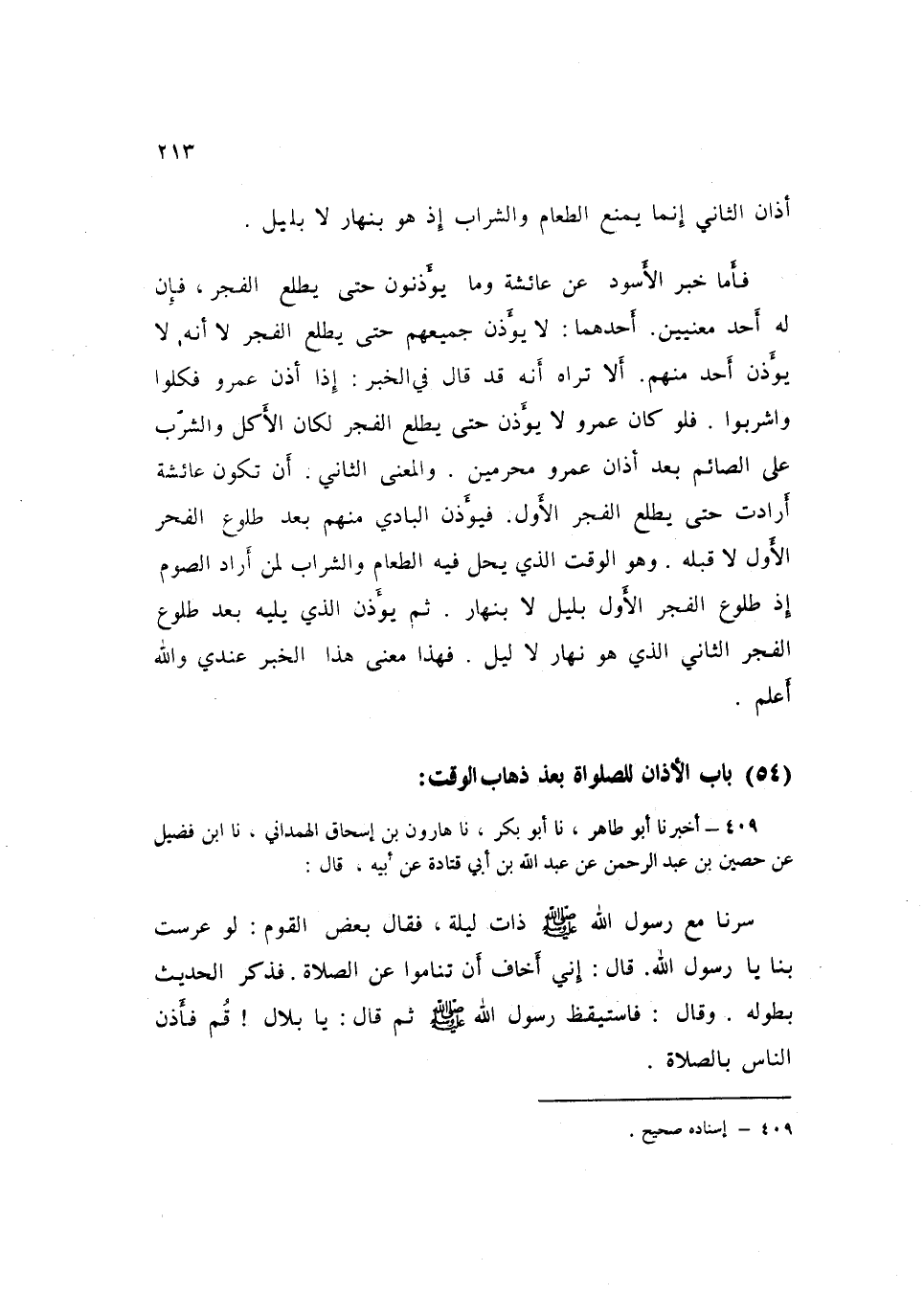 409 - نا هَارُونُ بْنُ إِسْحَاقَ الْهَمْدَانِيُّ، نا ابْنُ فُضَيْلٍ، عَنْ حُصَيْنِ بْنِ عَبْدِ الرَّحْمَنِ، عَنْ عَبْدِ اللَّهِ بْنِ أَبِي قَتَادَةَ، عَنْ أَبِيهِ قَالَ: سِرْنَا مَعَ رَسُولِ اللَّهِ صَلَّى اللهُ عَلَيْهِ وَسَلَّمَ ذَاتَ لَيْلَةٍ، فَقَالَ بَعْضُ الْقَوْمِ: لَوْ عَرَّسْتَ بِنَا يَا رَسُولَ اللَّهِ قَالَ: «إِنِّي أَخَافُ أَنْ تَنَامُوا عَنِ الصَّلَاةِ» ، فَذَكَرَ الْحَدِيثَ بِطُولِهِ، وَقَالَ: فَاسْتَيْقَظَ رَسُولُ اللَّهِ صَلَّى اللهُ عَلَيْهِ وَسَلَّمَ، ثُمَّ قَالَ: «§يَا بِلَالُ، قُمْ فَأَذِّنِ النَّاسَ بِالصَّلَاةَ» K409 - قال الأعظمي: إسناده صحيح
