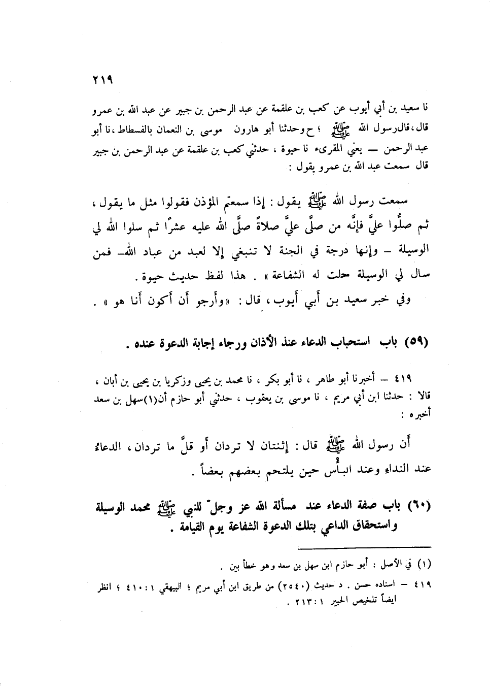 419 - نا مُحَمَّدُ بْنُ يَحْيَى، وَزَكَرِيَّا بْنُ يَحْيَى بْنِ أَبَانَ قَالَا: حَدَّثَنَا ابْنُ أَبِي مَرْيَمَ، نا مُوسَى بْنُ يَعْقُوبَ، حَدَّثَنِي أَبُو حَازِمٍ، أَنَّ سَهْلَ بْنَ سَعْدٍ أَخْبَرَهُ أَنَّ رَسُولَ اللَّهِ صَلَّى اللهُ عَلَيْهِ وَسَلَّمَ قَالَ: «§اثْنَتَانِ لَا تُرَدَّانِ أَوْ قَلَّ مَا تُرَدَّانِ الدُّعَاءُ عِنْدَ النِّدَاءِ، وَعِنْدَ الْبَأْسِ حِينَ يَلْتَحِمُ بَعْضُهُمْ بَعْضًا» K419 - قال الأعظمي: إسناده حسن