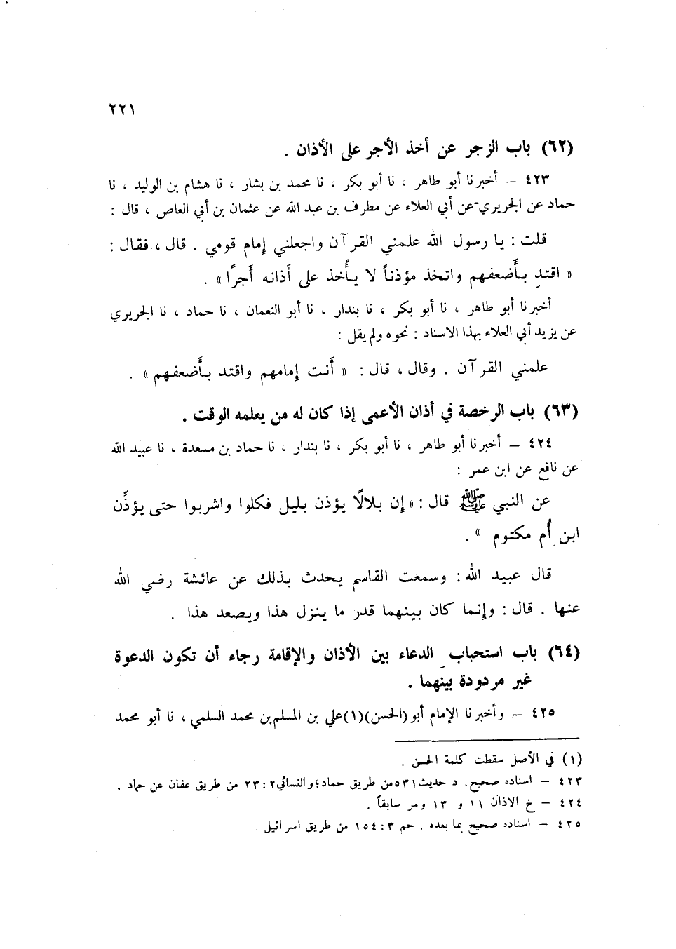 423 - نا مُحَمَّدُ بْنُ بَشَّارٍ، نا هِشَامُ بْنُ الْوَلِيدِ، نا حَمَّادٌ، عَنِ الْجُرَيْرِيِّ، عَنْ أَبِي الْعَلَاءِ، عَنْ مُطَرِّفِ بْنِ عَبْدِ اللَّهِ، عَنْ عُثْمَانَ بْنِ أَبِي الْعَاصِ قَالَ: قُلْتُ: يَا رَسُولَ اللَّهِ، عَلِّمْنِي الْقُرْآنَ وَاجْعَلْنِي إِمَامَ قَوْمِي قَالَ: فَقَالَ: «§اقْتَدِ بِأَضْعَفِهِمْ، وَاتَّخِذْ مُؤَذِّنًا لَا يَأْخُذُ عَلَى أَذَانِهِ أَجْرًا» نا بُنْدَارٌ، نا أَبُو النُّعْمَانِ، نا حَمَّادٌ، نا الْجُرَيْرِيُّ، عَنْ يَزِيدَ أَبِي الْعَلَاءِ بِهَذَا الْإِسْنَادِ نَحْوَهُ، وَلَمْ يَقُلْ: عَلِّمْنِي الْقُرْآنَ، وَقَالَ: قَالَ: «أَنْتَ إِمَامُهُمْ وَاقْتَدِ بِأَضْعَفِهِمْ» K423 - قال الأعظمي: إسناده صحيح