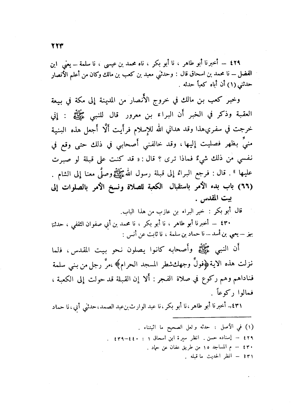 429 - ناه مُحَمَّدُ بْنُ عِيسَى، نا سَلَمَةُ يَعْنِي ابْنَ الْفَضْلِ، نا مُحَمَّدُ بْنُ إِسْحَاقَ قَالَ: وَحَدَّثَنِي مَعْبَدُ بْنُ كَعْبِ بْنِ مَالِكٍ، وَكَانَ مِنْ أَعْلَمِ الْأَنْصَارِ، حَدَّثَنِي أَنَّ أَبَاهُ كَعْبًا حَدَّثَهُ، وَخَبَرُ كَعْبِ بْنِ مَالِكٍ فِي خُرُوجِ الْأَنْصَارِ مِنَ الْمَدِينَةِ إِلَى مَكَّةَ فِي بَيْعَةِ الْعَقَبَةِ، وَذَكَرَ فِي الْخَبَرِ أَنَّ الْبَرَاءَ بْنَ مَعْرُورٍ قَالَ لِلنَّبِيِّ صَلَّى اللهُ عَلَيْهِ وَسَلَّمَ: §إِنِّي خَرَجْتُ فِي سَفَرِي هَذَا وَقَدْ هَدَانِي اللَّهُ لِلْإِسْلَامِ، فَرَأَيْتُ أَلَّا أَجْعَلَ هَذِهِ الْبِنْيَةَ مِنِّي بِظَهْرٍ فَصَلَّيْتُ إِلَيْهَا، وَقَدْ خَالَفَنِي أَصْحَابِي فِي ذَلِكَ حَتَّى وَقَعَ فِي نَفْسِي مِنْ ذَلِكَ شَيْءٌ، فَمَاذَا تَرَى؟ قَالَ: «قَدْ كُنْتَ عَلَى قِبْلَةٍ لَوْ صَبَرْتَ عَلَيْهَا» قَالَ: فَرَجَعَ الْبَرَاءُ إِلَى قِبْلَةِ رَسُولِ اللَّهِ صَلَّى اللهُ عَلَيْهِ وَسَلَّمَ وَصَلَّى مَعَنَا إِلَى الشَّامِK429 - قال الأعظمي: إسناده حسن