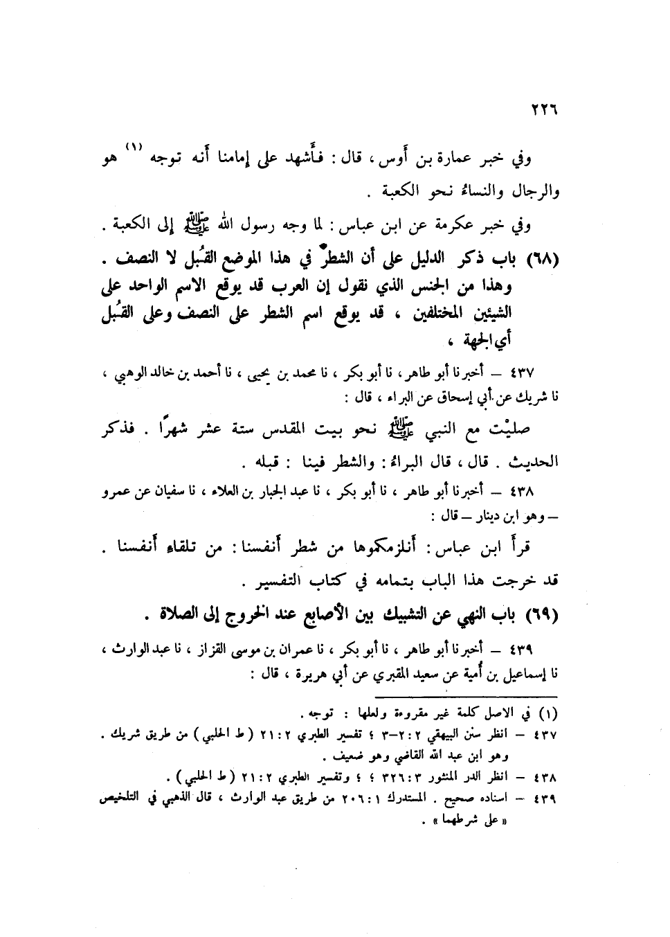 437 - نا مُحَمَّدُ بْنُ يَحْيَى، نا أَحْمَدُ بْنُ خَالِدٍ الْوَهْبِيُّ، نا شَرِيكٌ، عَنْ أَبِي إِسْحَاقَ، عَنِ الْبَرَاءِ قَالَ: «§صَلَّيْتُ مَعَ النَّبِيِّ صَلَّى اللهُ عَلَيْهِ وَسَلَّمَ نَحْوَ بَيْتِ الْمَقْدِسِ سِتَّةَ عَشَرَ شَهْرًا» فَذَكَرَ الْحَدِيثَ قَالَ: قَالَ الْبَرَاءُ: وَالشَّطْرُ فِينَا قِبَلَهُK437 - قال الأعظمي: انظر سنن البيهقي 2 / 2 - 3 وتفسير الطبري 2 / 21 من طريق شريك بن عبد الله القاضي وهو ضعيف