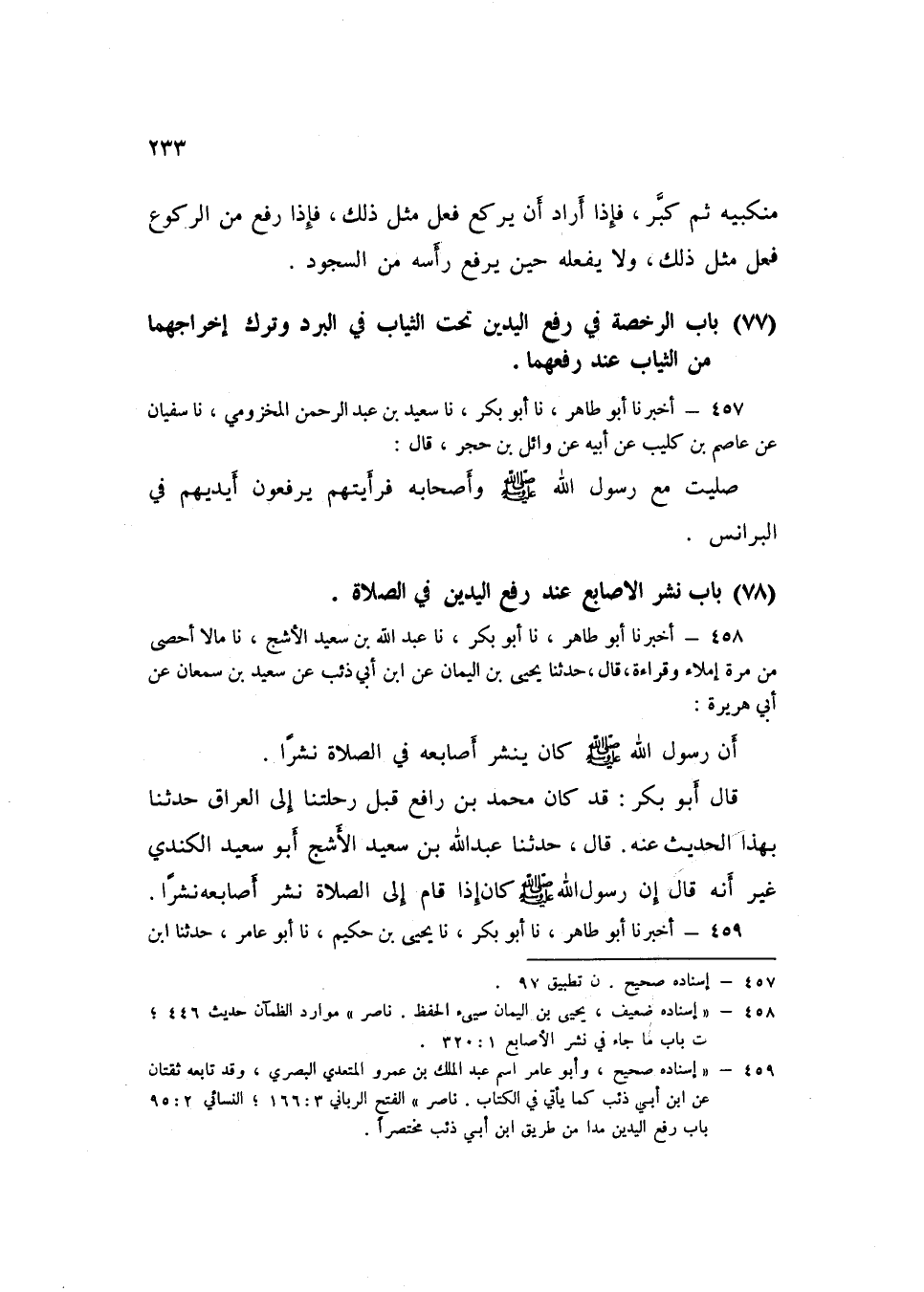 459 - نا يَحْيَى بْنُ حَكِيمٍ، نا أَبُو عَامِرٍ، حَدَّثَنَا ابْنُ أَبِي ذِئْبٍ، عَنْ سَعِيدِ بْنِ سَمْعَانَ قَالَ: دَخَلَ عَلَيْنَا أَبُو هُرَيْرَةَ مَسْجِدَ بَنِي وُرَيْقٍ قَالَ: " §ثَلَاثٌ كَانَ رَسُولُ اللَّهِ صَلَّى اللهُ عَلَيْهِ وَسَلَّمَ يَفْعَلُ بِهِنَّ، تَرَكَهُنَّ النَّاسُ، كَانَ إِذَا قَامَ إِلَى الصَّلَاةِ قَالَ: هَكَذَا، وَأَشَارَ أَبُو عَامِرٍ بِيَدِهِ وَلَمْ يُفَرِّجْ بَيْنَ أَصَابِعِهِ، وَلَمْ يَضُمَّهَا، وَقَالَ: هَكَذَا أَرَانَا ابْنُ أَبِي ذِئْبٍ " قَالَ أَبُو بَكْرٍ: وَأَشَارَ لَنَا يَحْيَى بْنُ حَكِيمٍ وَرَفَعَ يَدَيْهِ، فَفَرَّجَ بَيْنَ أَصَابِعِهِ تَفْرِيجًا لَيْسَ بِالْوَاسِعِ، وَلَمْ يَضُمَّ بَيْنَ أَصَابِعِهِ، وَلَا بَاعَدَ بَيْنَهُمَا، رَفَعَ يَدَيْهِ فَوْقَ رَأْسِهِ مَدًّا، وَكَانَ يَقِفُ قَبْلَ الْقِرَاءَةِ هُنَيَّةً يَسْأَلُ اللَّهَ تَعَالَى مِنْ فَضْلِهِ، وَكَانَ يُكَبِّرُ فِي الصَّلَاةِ كُلَّمَا سَجَدَ وَرَفَعَ قَالَ أَبُو بَكْرٍ: هَذِهِ الشَّبَكَةُ شَبَكَةٌ سَمِجَةٌ بِحَالٍ، مَا أَدْرِي مِمَّنْ هِيَ، وَهَذِهِ اللَّفْظَةُ إِنَّمَا هِيَ: رَفَعَ يَدَيْهِ مَدًّا، لَيْسَ فِيهِ شَكٌّ وَلَا ارْتِيَابٌ أَنْ يَرْفَعَ الْمُصَلِّي يَدَيْهِ عِنْدَ افْتِتَاحِ الصَّلَاةِ فَوْقَ رَأْسِهِK459 - قال الألباني: إسناده صحيح وأبو عامر اسمه عبد الملك بن عمرو المتعدي البصري وقد تابعه ثقتان عن ابن أبي ذئب كما يأتي في الكتاب