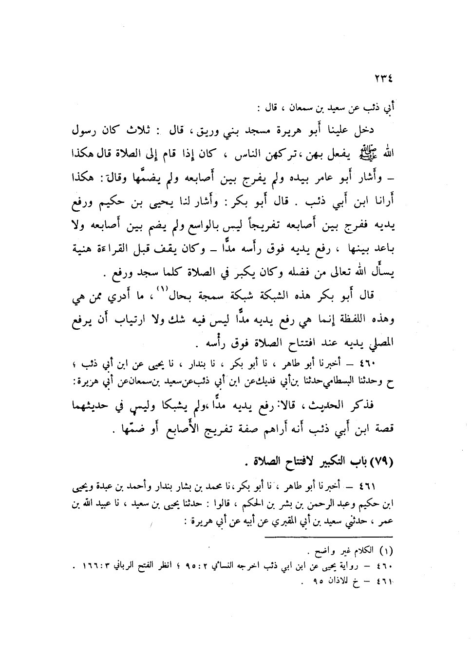 460 - نا بُنْدَارٌ، نا يَحْيَى، عَنِ ابْنِ أَبِي ذِئْبٍ، ح وَحَدَّثَنَا الْبِسْطَامِيُّ، حَدَّثَنَا ابْنُ أَبِي فُدَيْكٍ، عَنِ ابْنِ أَبِي ذِئْبٍ، عَنْ سَعِيدِ بْنِ سَمْعَانَ، عَنْ أَبِي هُرَيْرَةَ، فَذَكَرَ الْحَدِيثَ قَالَا: «§رَفَعَ يَدَيْهِ مَدًّا وَلَمْ يُشَبِّكَا» ، وَلَيْسَ فِي حَدِيثِهِمَا قِصَّةُ ابْنِ أَبِي ذِئْبٍ أَنَّهُ أَرَاهُمْ صِفَةَ تَفْرِيجِ الْأَصَابِعِ أَوْ ضَمَّهَا