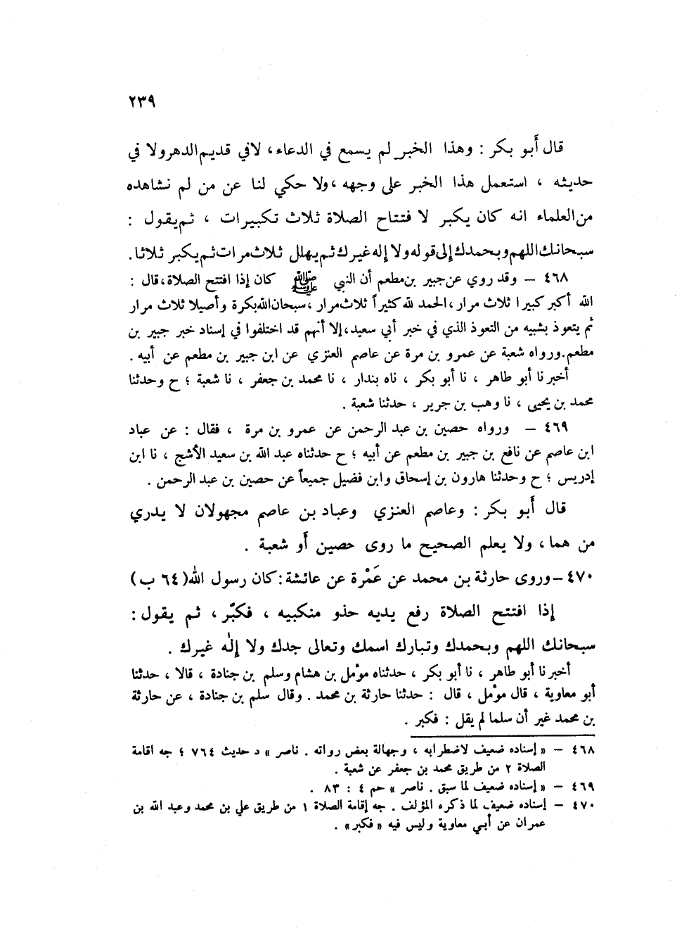 471 - حَدَّثَنَاهُ مُؤَمَّلُ بْنُ هِشَامٍ، وَسَلْمُ بْنُ جُنَادَةَ قَالَا: حَدَّثَنَا أَبُو مُعَاوِيَةَ قَالَ مُؤَمَّلٌ قَالَ: حَدَّثَنَا حَارِثَةُ بْنُ مُحَمَّدٍ، وَقَالَ سَلْمُ بْنُ جُنَادَةَ: عَنْ حَارِثَةَ بْنِ مُحَمَّدٍ، غَيْرُ أَنَّ سَلْمًا لَمْ يَقُلْ: فَكَبَّرَ قَالَ أَبُو بَكْرٍ: وَحَارِثَةُ بْنُ مُحَمَّدٍ رَحِمَهُ اللَّهُ، لَيْسَ مِمَّنْ يَحْتَجُّ أَهْلُ الْحَدِيثِ بِحَدِيثِهِ، وَهَذَا صَحِيحٌ عَنْ عُمَرَ بْنِ الْخَطَّابِ أَنَّهُ كَانَ يَسْتَفْتِحُ الصَّلَاةَ مِثْلَ حَدِيثِ حَارِثَةَ، لَا عَنِ النَّبِيِّ صَلَّى اللهُ عَلَيْهِ وَسَلَّمَ، وَلَسْتُ أَكْرَهُ الِافْتِتَاحَ بِقَوْلِهِ: سُبْحَانَكَ اللَّهُمَّ وَبِحَمْدِكَ عَلَى مَا ثَبَتَ عَنِ الْفَارُوقِ رَضِي اللَّهُ عَنْهُ أَنَّهُ كَانَ يَسْتَفْتِحُ الصَّلَاةَ، غَيْرُ أَنَّ الِافْتِتَاحَ بِمَا ثَبَتَ عَنِ النَّبِيِّ صَلَّى اللهُ عَلَيْهِ وَسَلَّمَ فِي خَبَرِ عَلِيِّ بْنِ أَبِي طَالِبٍ، وَأَبِي هُرَيْرَةَ، وَغَيْرِهِمَا بِنَقْلِ الْعَدْلِ عَنِ الْعَدْلِ مَوْصُولًا إِلَيْهِ صَلَّى اللهُ عَلَيْهِ وَسَلَّمَ أَحَبُّ إِلَيَّ، وَأَوْلَى بِالِاسْتِعْمَالِ إِذِ اتِّبَاعُ سُنَّةِ النَّبِيِّ صَلَّى اللهُ عَلَيْهِ وَسَلَّمَ أَفْضَلُ وَخَيْرٌ مِنْ غَيْرِهَاK470 - قال الأعظمي: إسناده ضعيف لما ذكره المؤلف