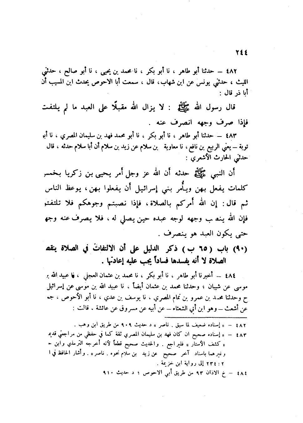483 - نا أَبُو مُحَمَّدٍ فَهْدُ بْنُ سُلَيْمَانَ الْمِصْرِيُّ، نا أَبُو تَوْبَةَ يَعْنِي الرَّبِيعَ بْنَ نَافِعٍ، نا مُعَاوِيَةُ بْنُ سَلَامٍ، عَنْ زَيْدِ بْنِ سَلَامٍ، أَنَّ أَبَا سَلَامٍ، حَدَّثَهُ قَالَ: حَدَّثَنِي الْحَارِثُ الْأَشْعَرِيُّ، أَنَّ النَّبِيَّ صَلَّى اللهُ عَلَيْهِ وَسَلَّمَ حَدَّثَهُ، " أَنَّ §اللَّهَ عَزَّ وَجَلَّ أَمَرَ يَحْيَى بْنَ زَكَرِيَّا بِخَمْسِ كَلِمَاتٍ يَفْعَلُ بِهِنَّ وَيَأْمُرُ بَنِي إِسْرَائِيلَ أَنْ يَفْعَلُوا بِهِنَّ، يُوعَظُ النَّاسُ، ثُمَّ قَالَ: إِنَّ اللَّهَ أَمْرَكُمْ بِالصَّلَاةِ، فَإِذَا نَصَبْتُمْ وُجُوهَكُمْ فَلَا تَلْتَفِتُوا فَإِنَّ اللَّهَ يَنْصِبُ وَجْهَهُ لِوَجْهِ عَبْدِهِ حِينَ يُصَلِّي لَهُ، فَلَا يَصْرِفُ عَنْهُ وَجْهَهُ حَتَّى يَكُونَ الْعَبْدُ هُوَ يَنْصَرِفُ "K483 - قال الألباني: إسناده صحيح إن كان فهد بن سليمان المصري ثقة. . والحديث صحيح قطعا لأنه أخرجه الترمذي وابن حبان وغيرهما بإسناد آخر صحيح عن زيد بن سلام نحوه