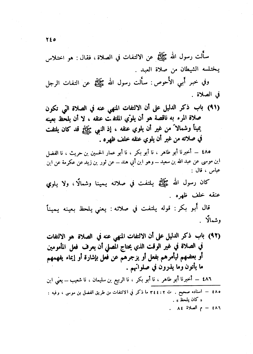 485 - نا أَبُو عَمَّارٍ الْحُسَيْنُ بْنُ حُرَيْثٍ، نا الْفَضْلُ بْنُ مُوسَى، عَنْ عَبْدِ اللَّهِ بْنِ سَعِيدٍ وَهُوَ ابْنُ أَبِي هِنْدَ، عَنْ ثَوْرِ بْنِ زَيْدٍ، عَنْ عِكْرِمَةَ، عَنِ ابْنِ عَبَّاسٍ قَالَ: «كَانَ رَسُولُ اللَّهِ صَلَّى اللهُ عَلَيْهِ وَسَلَّمَ §يَلْتَفِتُ فِي صَلَاتِهِ يَمِينًا وَشِمَالًا، وَلَا يَلْوِي عُنُقَهُ خَلْفَ ظَهْرِهِ» قَالَ أَبُو بَكْرٍ: قَوْلُهُ يَلْتَفِتُ فِي صَلَاتِهِ - يَعْنِي يَلْحَظُ بِعَيْنِهِ يَمِينًا وَشِمَالًاK485 - قال الألباني: إسناده صحيح