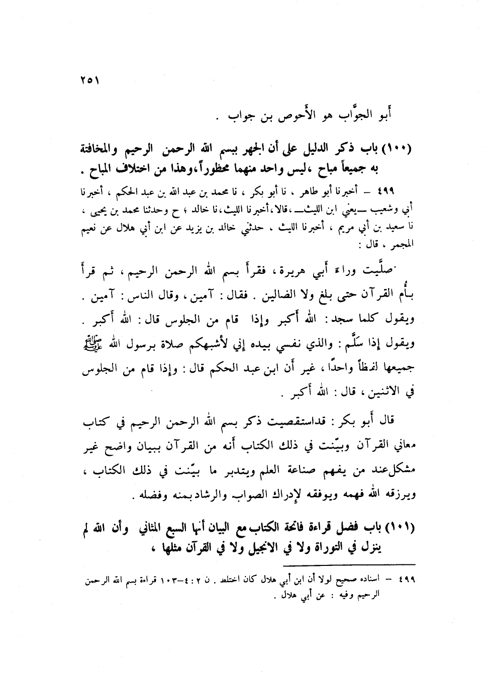499 - نا مُحَمَّدُ بْنُ عَبْدِ اللَّهِ بْنِ عَبْدِ الْحَكَمِ، أَخْبَرَنَا أَبِي وَشُعَيْبٌ يَعْنِي ابْنَ اللَّيْثِ قَالَا: أَخْبَرَنَا اللَّيْثُ، نا خَالِدٌ، ح وَحَدَّثَنَا مُحَمَّدُ بْنُ يَحْيَى، نا سَعِيدُ بْنُ أَبِي مَرْيَمَ، أَخْبَرَنَا اللَّيْثُ، حَدَّثَنِي خَالِدُ بْنُ يَزِيدَ، عَنِ ابْنِ أَبِي هِلَالٍ، عَنْ نُعَيْمٍ الْمُجْمِرِ قَالَ: صَلَّيْتُ وَرَاءَ أَبِي هُرَيْرَةَ، فَقَرَأَ: " {§بِسْمِ اللَّهِ الرَّحْمَنِ الرَّحِيمِ} [الفاتحة: 1] ، ثُمَّ قَرَأَ بِأُمِّ الْقُرْآنِ حَتَّى بَلَغَ {وَلَا الضَّالِّينَ} [الفاتحة: 7] فَقَالَ: آمِينَ، وَقَالَ النَّاسُ: آمِينَ، وَيَقُولُ كُلَّمَا سَجَدَ: اللَّهُ أَكْبَرُ، وَإِذَا قَامَ مِنَ الْجُلُوسِ قَالَ: اللَّهُ أَكْبَرُ، وَيَقُولُ إِذَا سَلَّمَ: وَالَّذِي نَفْسِي بِيَدِهِ إِنِّي لَأَشْبَهُكُمْ صَلَاةً بِرَسُولِ اللَّهِ صَلَّى اللهُ عَلَيْهِ وَسَلَّمَ، جَمِيعُهَا لَفْظًا وَاحِدًا، غَيْرُ أَنَّ ابْنَ عَبْدِ الْحَكَمِ قَالَ: وَإِذَا قَامَ مِنَ الْجُلُوسِ فِي الِاثْنَيْنِ قَالَ: اللَّهُ أَكْبَرُ " قَالَ أَبُو بَكْرٍ: قَدِ اسْتَقْصَيْتُ ذِكْرَ {بِسْمِ اللَّهِ الرَّحْمَنِ الرَّحِيمِ} [الفاتحة: 1] فِي كِتَابِ مَعَانِي الْقُرْآنِ، وَبَيَّنْتُ فِي ذَلِكَ الْكِتَابِ أَنَّهُ مِنَ الْقُرْآنِ بِبَيَانٍ وَاضِحٍ غَيْرِ مُشْكِلٍ عِنْدَ مَنْ يَفْهَمُ صِنَاعَةَ الْعِلْمِ، وَيَتَدَبَّرُ مَا بَيَّنْتُ فِي ذَلِكَ الْكِتَابِ، وَيَرْزُقُهُ اللَّهُ فَهْمَهُ وَيُوَفِّقُهُ لِإِدْرَاكِ الصَّوَابِ وَالرَّشَادِ بِمَنِّهِ وَفَضْلِهِK499 - قال الأعظمي: إسناده صحيح لولا أن ابن أبي هلال كان اختلط