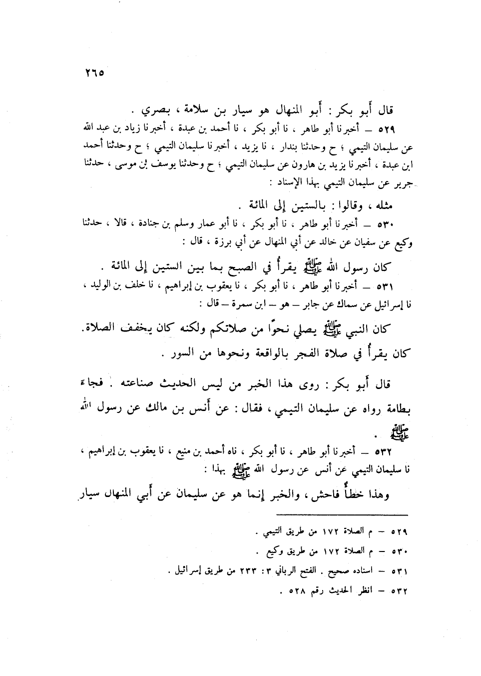 532 - ناه أَحْمَدُ بْنُ مَنِيعٍ، نا يَعْقُوبُ بْنُ إِبْرَاهِيمَ، نا سُلَيْمَانُ التَّيْمِيُّ، عَنْ أَنَسٍ، عَنْ رَسُولِ اللَّهِ صَلَّى اللهُ عَلَيْهِ وَسَلَّمَ بِهَذَا. وَهَذَا خَطَأٌ فَاحِشٌ، وَالْخَبَرُ إِنَّمَا هُوَ عَنْ سُلَيْمَانَ، عَنْ أَبِي الْمِنْهَالِ سَيَّارِ بْنِ سَلَامَةَ، عَنْ أَبِي بَرْزَةَ، كَذَا رَوَاهُ هَؤُلَاءِ الْحُفَّاظُ الَّذِينَ الْحَدِيثُ صِنَاعَتُهُمْK531 - قال الأعظمي: إسناده صحيح
