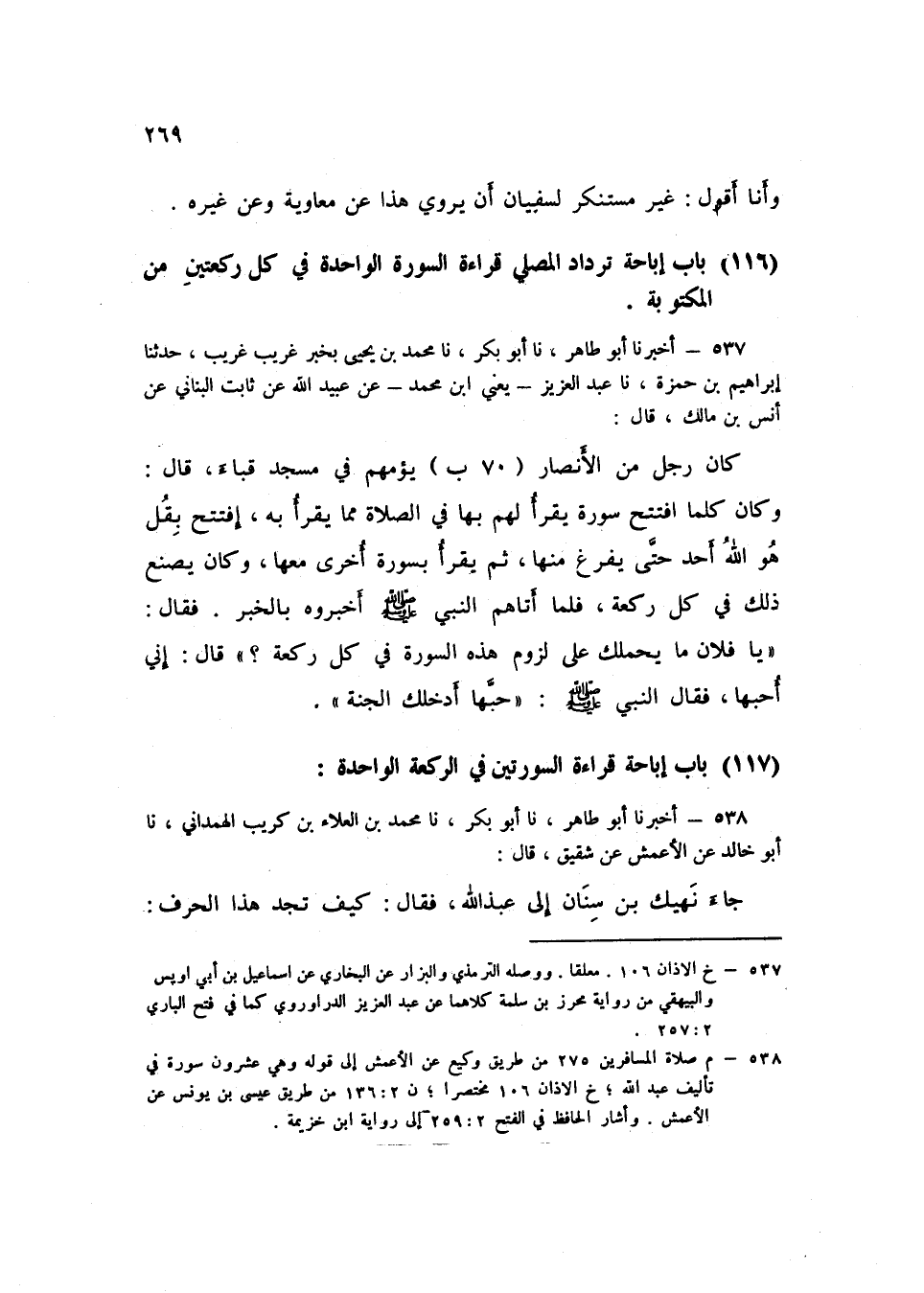 537 - نا مُحَمَّدُ بْنُ يَحْيَى بِخَبَرٍ غَرِيبٍ غَرِيبٍ، حَدَّثَنَا إِبْرَاهِيمُ بْنُ حَمْزَةَ، نا عَبْدُ الْعَزِيزِ يَعْنِي ابْنَ مُحَمَّدٍ، عَنْ عُبَيْدِ اللَّهِ، عَنْ ثَابِتٍ الْبُنَانِيِّ، عَنْ أَنَسِ بْنِ مَالِكٍ قَالَ: كَانَ رَجُلٌ مِنَ الْأَنْصَارِ يَؤُمُّهُمْ فِي مَسْجِدِ قُبَاءَ قَالَ: وَكَانَ §كُلَّمَا افْتَتَحَ سُورَةً يَقْرَأُ لَهُمْ بِهَا فِي الصَّلَاةِ مِمَّا يَقْرَأُ بِهِ افْتَتَحَ بِـ قُلْ هُوَ اللَّهُ أَحَدٌ حَتَّى يَفْرُغَ مِنْهَا، ثُمَّ يَقْرَأُ بِسُورَةٍ أُخْرَى مَعَهَا، وَكَانَ يَصْنَعُ ذَلِكَ فِي كُلِّ رَكْعَةٍ فَلَمَّا أَتَاهُمُ النَّبِيُّ صَلَّى اللهُ عَلَيْهِ وَسَلَّمَ أَخْبَرُوهُ بِالْخَبَرِ، فَقَالَ: «يَا فُلَانُ، مَا يَحْمِلُكَ عَلَى لُزُومِ هَذِهِ السُّورَةِ فِي كُلِّ رَكْعَةٍ؟» قَالَ: إِنِّي أُحِبُّهَا، فَقَالَ النَّبِيُّ صَلَّى اللهُ عَلَيْهِ وَسَلَّمَ: «حُبُّهَا أَدْخَلَكَ الْجَنَّةَ»