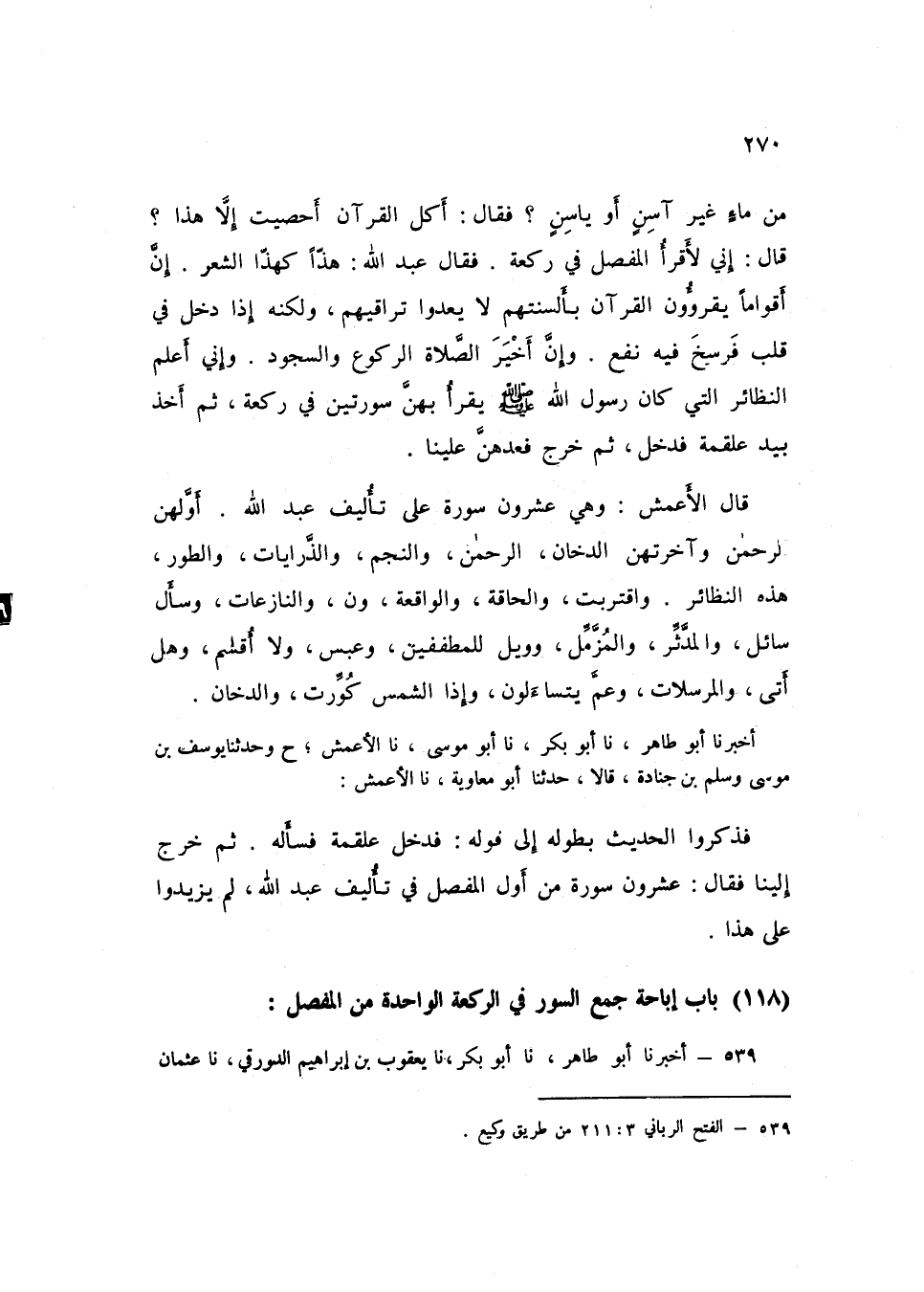 539 - نا يَعْقُوبُ بْنُ إِبْرَاهِيمَ الدَّوْرَقِيُّ، نا عُثْمَانُ بْنُ عُمَرَ، نا كَهْمَسٌ، وَحَدَّثَنَا سَلْمُ بْنُ جُنَادَةَ، أنا وَكِيعٌ، عَنْ كَهْمَسِ بْنِ الْحَسَنِ، عَنْ عَبْدِ اللَّهِ بْنِ شَقِيقٍ الْعُقَيْلِيِّ قَالَ: قُلْتُ لِعَائِشَةَ: هَلْ كَانَ رَسُولُ اللَّهِ صَلَّى اللهُ عَلَيْهِ وَسَلَّمَ §يَجْمَعُ بَيْنَ السُّوَرِ فِي الرَّكْعَةِ؟ قَالَتِ: «الْمُفَصَّلُ» هَذَا حَدِيثُ وَكِيعٍ