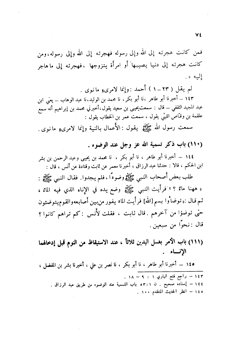 143 - نا مُحَمَّدُ بْنُ الْوَلِيدِ، نا عَبْدُ الْوَهَّابِ يَعْنِي ابْنَ عَبْدِ الْمَجِيدِ الثَّقَفِيَّ قَالَ: سَمِعْتُ يَحْيَى بْنَ سَعِيدٍ يَقُولُ: أَخْبَرَنِي مُحَمَّدُ بْنُ إِبْرَاهِيمَ، أَنَّهُ سَمِعَ عَلْقَمَةَ بْنَ وَقَّاصٍ اللَّيْثِيَّ يَقُولُ: سَمِعْتُ عُمَرَ بْنَ الْخَطَّابِ يَقُولُ: سَمِعْتُ رَسُولَ اللَّهِ صَلَّى اللهُ عَلَيْهِ وَسَلَّمَ يَقُولُ: «§الْأَعْمَالُ بِالنِّيَّةِ، وَإِنَّمَا لِامْرِئٍ مَا نَوَى»