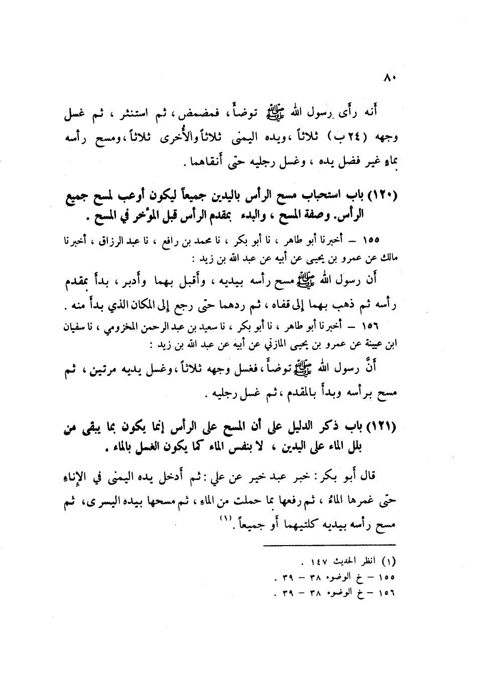 155 - نا مُحَمَّدُ بْنُ رَافِعٍ، نا عَبْدُ الرَّزَّاقِ، أَخْبَرَنَا مَالِكٌ، عَنْ عَمْرِو بْنِ يَحْيَى، عَنْ أَبِيهِ، عَنْ عَبْدِ اللَّهِ بْنِ زَيْدٍ أَنَّ رَسُولَ اللَّهِ صَلَّى اللهُ عَلَيْهِ وَسَلَّمَ §مَسَحَ رَأْسَهُ بِيَدَيْهِ، وَأَقْبَلَ بِهِمَا وَأَدْبَرَ، بَدَأَ بِمُقَدَّمِ رَأْسِهِ، ثُمَّ ذَهَبَ بِهِمَا إِلَى قَفَاهُ، ثُمَّ رَدَّهُمَا حَتَّى رَجَعَ إِلَى الْمَكَانِ الَّذِي بَدَأَ مِنْهُ "
