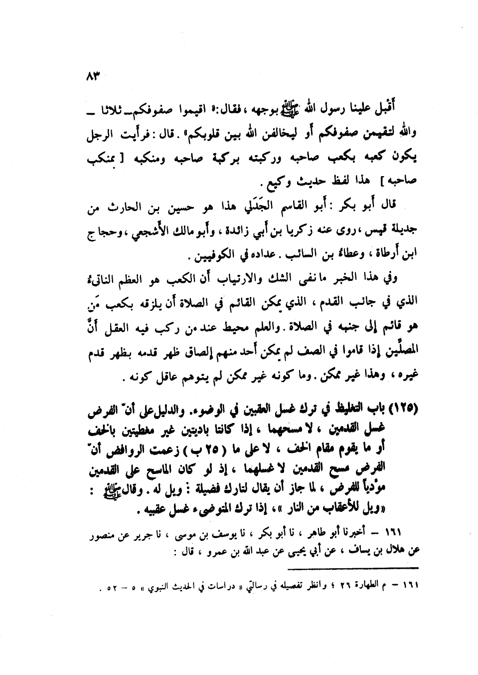 161 - نا يُوسُفُ بْنُ مُوسَى، نا جَرِيرٌ، عَنْ مَنْصُورٍ، عَنْ هِلَالِ بْنِ يَسَافٍ، عَنْ أَبِي يَحْيَى، عَنْ عَبْدِ اللَّهِ بْنِ عَمْرٍو قَالَ: رَجَعْنَا مَعَ رَسُولِ اللَّهِ صَلَّى اللهُ عَلَيْهِ وَسَلَّمَ مِنْ مَكَّةَ إِلَى الْمَدِينَةِ حَتَّى إِذَا كُنَّا بِمَاءٍ بِالطَّرِيقِ تَعَجَّلَ قَوْمٌ عِنْدَ الْعَصْرِ فَتَوَضَّئُوا وَهُمْ عِجَالٌ، فَانْتَهَيْنَا إِلَيْهِمْ وَأَعْقَابُهُمْ بِيضٌ تَلُوحُ لَمْ يَمَسَّهَا الْمَاءُ فَقَالَ: رَسُولُ اللَّهِ صَلَّى اللهُ عَلَيْهِ وَسَلَّمَ: «§وَيْلٌ لِلْأَعْقَابِ مِنَ النَّارِ أَسْبِغُوا الْوُضُوءَ»