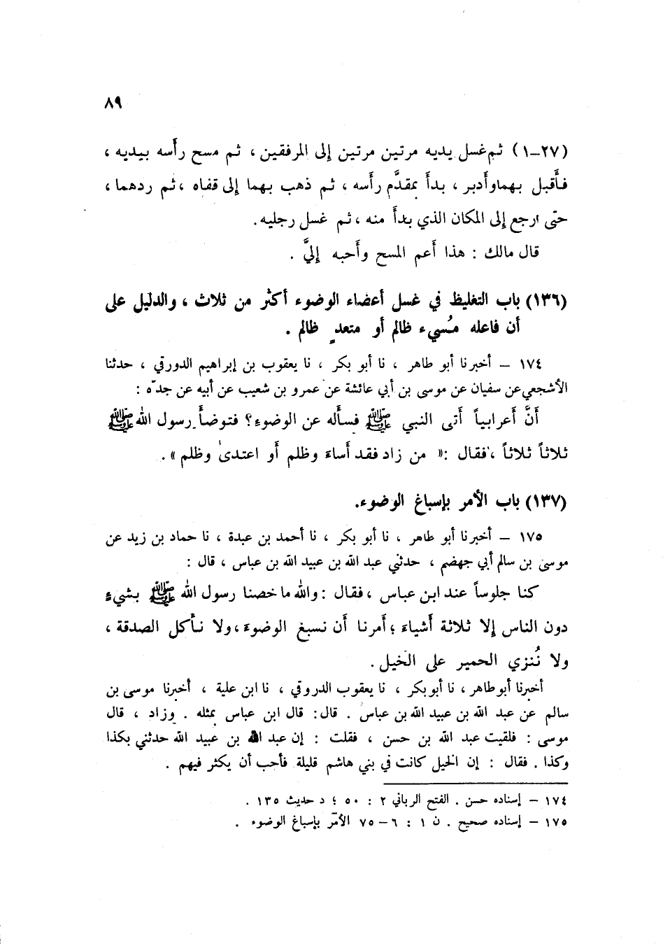 174 - نا يَعْقُوبُ بْنُ إِبْرَاهِيمَ الدَّوْرَقِيُّ، حَدَّثَنَا الْأَشْجَعِيُّ، عَنْ سُفْيَانَ، عَنْ مُوسَى بْنِ أَبِي عَائِشَةَ، عَنْ عَمْرِو بْنِ شُعَيْبٍ، عَنْ أَبِيهِ، عَنْ جَدِّهِ، أَنَّ أَعْرَابِيًّا أَتَى النَّبِيَّ صَلَّى اللهُ عَلَيْهِ وَسَلَّمَ، فَسَأَلَهُ عَنِ الْوُضُوءِ، §فَتَوَضَّأَ رَسُولُ اللَّهِ صَلَّى اللهُ عَلَيْهِ وَسَلَّمَ ثَلَاثًا ثَلَاثًا، فَقَالَ: «مَنْ زَادَ فَقَدْ أَسَاءَ وَظَلَمَ أَوِ اعْتَدَى وَظَلَمَ» K174 - قال الأعظمي: إسناده حسن