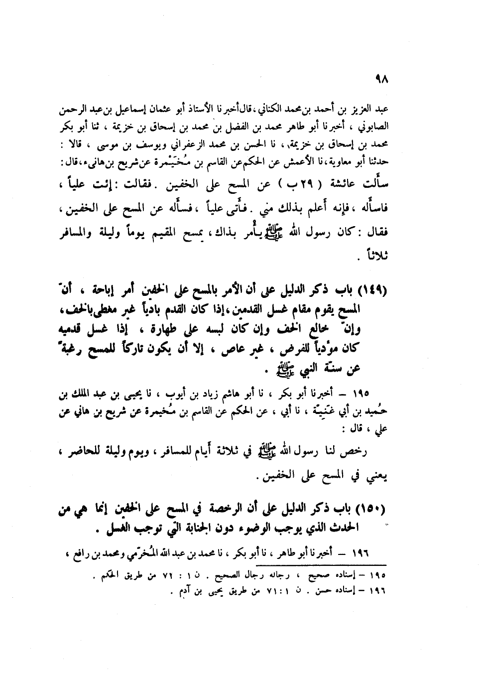 196 - نا مُحَمَّدُ بْنُ عَبْدِ اللَّهِ الْمُخَرِّمِيُّ، وَمُحَمَّدُ بْنُ رَافِعٍ قَالَا: حَدَّثَنَا يَحْيَى بْنُ آدَمَ، نا سُفْيَانُ، عَنْ عَاصِمٍ، عَنْ زِرِّ بْنِ حُبَيْشٍ قَالَ: أَتَيْتُ صَفْوَانَ بْنَ عَسَّالٍ الْمُرَادِيَّ، فَسَأَلْتُهُ عَنِ الْمَسْحِ عَلَى الْخُفَّيْنِ فَقَالَ: «كُنَا نَكُونُ مَعَ رَسُولِ اللَّهِ صَلَّى اللهُ عَلَيْهِ وَسَلَّمَ §فَأَمَرَنَا أَنْ لَا نَنْزِعَ خِفَافَنَا ثَلَاثَةَ أَيَّامٍ - يَعْنِي فِي السَّفَرِ - إِلَّا مِنْ جَنَابَةٍ، وَلَكِنْ مِنْ غَائِطٍ، وَبَوْلٍ، وَنَوْمٍ» K196 - قال الأعظمي: إسناده حسن