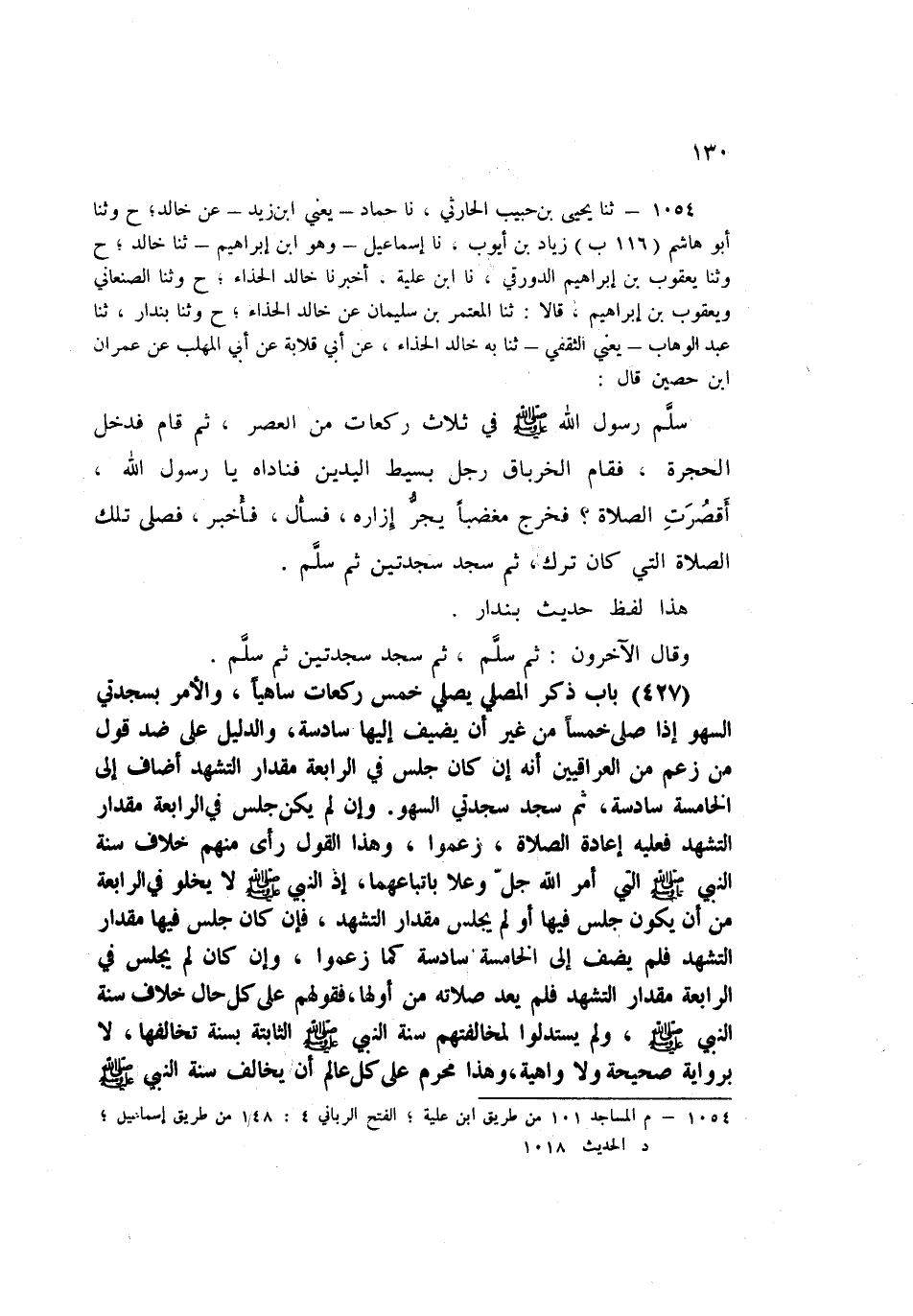 1054 - ثنا يَحْيَى بْنُ حَبِيبٍ الْحَارِثِيُّ، نا حَمَّادٌ يَعْنِي ابْنَ زَيْدٍ، عَنْ خَالِدٍ، ح وَثنا أَبُو هَاشِمٍ زِيَادُ بْنُ أَيُّوبَ، نا إِسْمَاعِيلُ وَهُوَ ابْنُ إِبْرَاهِيمَ، ثنا خَالِدٌ، ح وَثنا يَعْقُوبُ بْنُ إِبْرَاهِيمَ الدَّوْرَقِيُّ، نا ابْنُ عُلَيَّةَ، أَخْبَرَنَا خَالِدٌ الْحَذَّاءُ، ح وَثنا الصَّنْعَانِيُّ، وَيَعْقُوبُ بْنُ إِبْرَاهِيمَ قَالَا: ثنا الْمُعْتَمِرُ بْنُ سُلَيْمَانَ، عَنْ خَالِدٍ الْحَذَّاءِ، ح وَثنا بُنْدَارٌ، ثنا عَبْدُ الْوَهَّابِ يَعْنِي الثَّقَفِيَّ، ثنا بِهِ خَالِدٌ الْحَذَّاءُ، عَنْ أَبِي قِلَابَةَ، عَنْ أَبِي الْمُهَلَّبِ، عَنْ عِمْرَانَ بْنِ حُصَيْنٍ قَالَ: سَلَّمَ رَسُولُ اللَّهِ صَلَّى اللهُ عَلَيْهِ وَسَلَّمَ فِي ثَلَاثِ رَكَعَاتٍ مِنَ الْعَصْرِ، ثُمَّ قَامَ فَدَخَلَ الْحُجْرَةَ، فَقَامَ الْخِرْبَاقُ رَجُلٌ بَسِيطُ الْيَدَيْنِ، فَنَادَاهُ: يَا رَسُولَ اللَّهِ، §أَقَصُرَتِ الصَّلَاةُ؟ فَخَرَجَ مُغْضَبًا يَجُرُّ إِزَارَهُ، فَسَأَلَ فَأُخْبِرَ، فَصَلَّى تِلْكَ الصَّلَاةَ الَّتِي كَانَ تَرَكَ، ثُمَّ سَجَدَ سَجْدَتَيْنِ، ثُمَّ سَلَّمَ. هَذَا لَفْظُ حَدِيثِ بُنْدَارٍ وَقَالَ الْآخَرُونَ: ثُمَّ سَلَّمَ، ثُمَّ سَجَدَ سَجْدَتَيْنِ، ثُمَّ سَلَّمَ