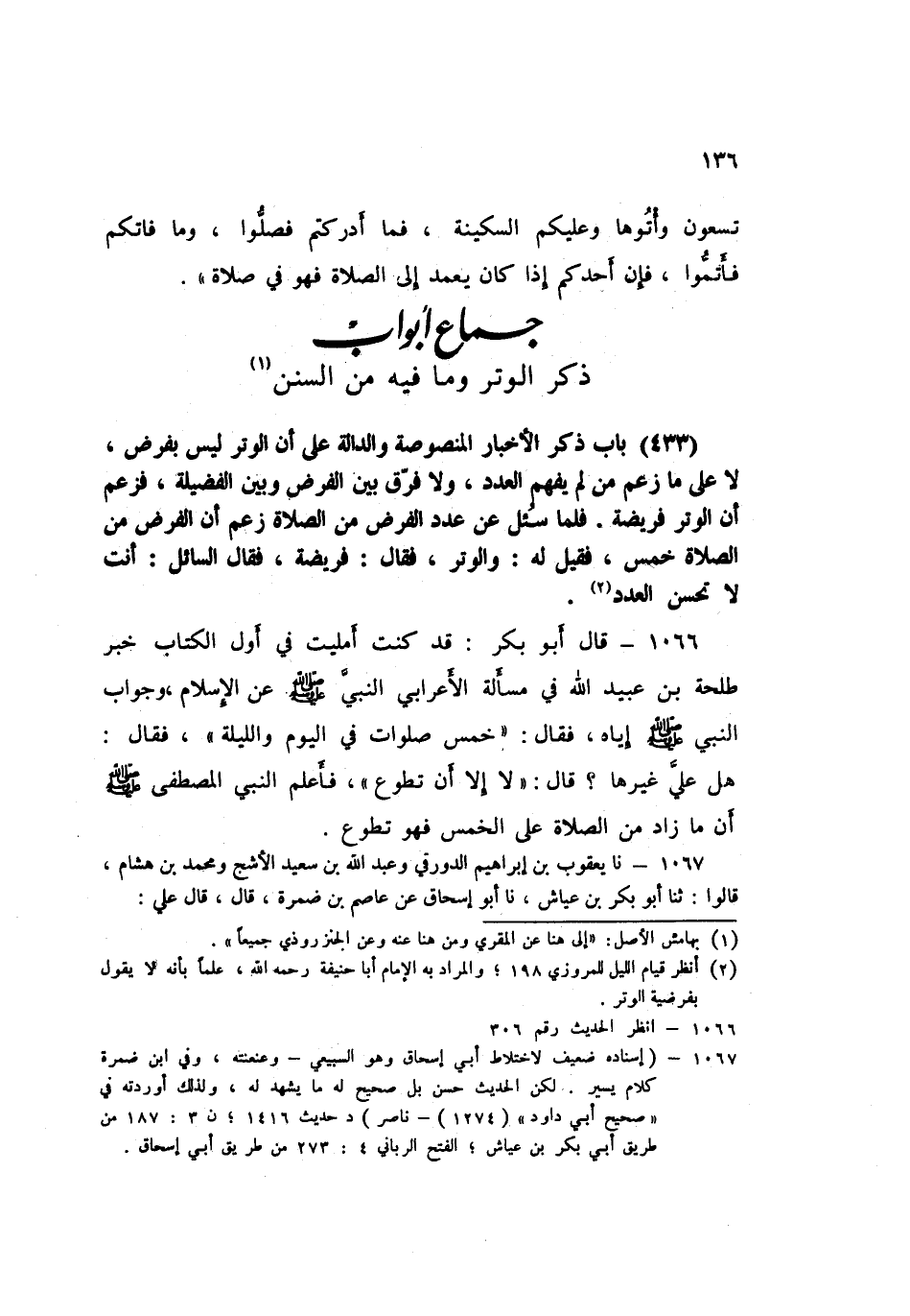 1066 - قَالَ أَبُو بَكْرٍ: قَدْ كُنْتُ أَمْلَيْتُ فِي أَوَّلِ الْكِتَابِ خَبَرَ طَلْحَةَ بْنِ عُبَيْدِ اللَّهِ فِي مَسْأَلَةِ الْأَعْرَابِيِّ النَّبِيَّ صَلَّى اللهُ عَلَيْهِ وَسَلَّمَ عَنِ الْإِسْلَامِ، وَجَوَابَ النَّبِيِّ صَلَّى اللهُ عَلَيْهِ وَسَلَّمَ إِيَّاهُ، فَقَالَ: «خَمْسُ صَلَوَاتٍ فِي الْيَوْمِ وَاللَّيْلَةِ» ، فَقَالَ: هَلْ عَلَيَّ غَيْرُهَا؟ قَالَ: «لَا، إِلَّا أَنْ تَطَوَّعَ» ، فَأَعْلَمَ النَّبِيُّ الْمُصْطَفَى صَلَّى اللهُ عَلَيْهِ وَسَلَّمَ أَنَّ مَا زَادَ مِنَ الصَّلَاةِ عَلَى الْخَمْسِ فَهُوَ تَطَوُّعٌ