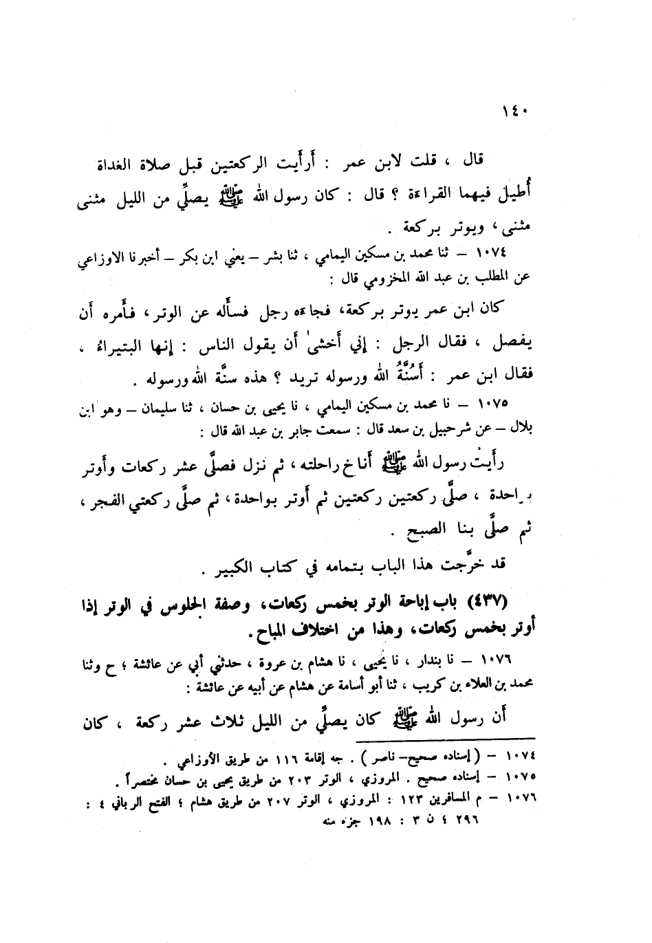 1074 - ثنا مُحَمَّدُ بْنُ مِسْكِينٍ الْيَمَامِيُّ، ثنا بِشْرٌ يَعْنِي ابْنَ بَكْرٍ، أَخْبَرَنَا الْأَوْزَاعِيُّ، عَنِ الْمُطَّلِبِ بْنِ عَبْدِ اللَّهِ الْمَخْزُومِيِّ قَالَ: كَانَ ابْنُ عُمَرَ يُوتِرُ بِرَكْعَةٍ، فَجَاءَهُ رَجُلٌ فَسَأَلَهُ عَنِ الْوِتْرِ، فَأَمَرَهُ أَنْ يَفْصِلَ، فَقَالَ الرَّجُلُ: إِنِّي أَخْشَى أَنْ يَقُولَ النَّاسُ: إِنَّهَا الْبُتَيْرَاءُ، فَقَالَ ابْنُ عُمَرَ: §أَسُنَّةَ اللَّهِ وَرَسُولِهِ تُرِيدُ؟ هَذِهِ سُنَّةُ اللَّهِ وَرَسُولِهِK1074 - قال الألباني: إسناده صحيح