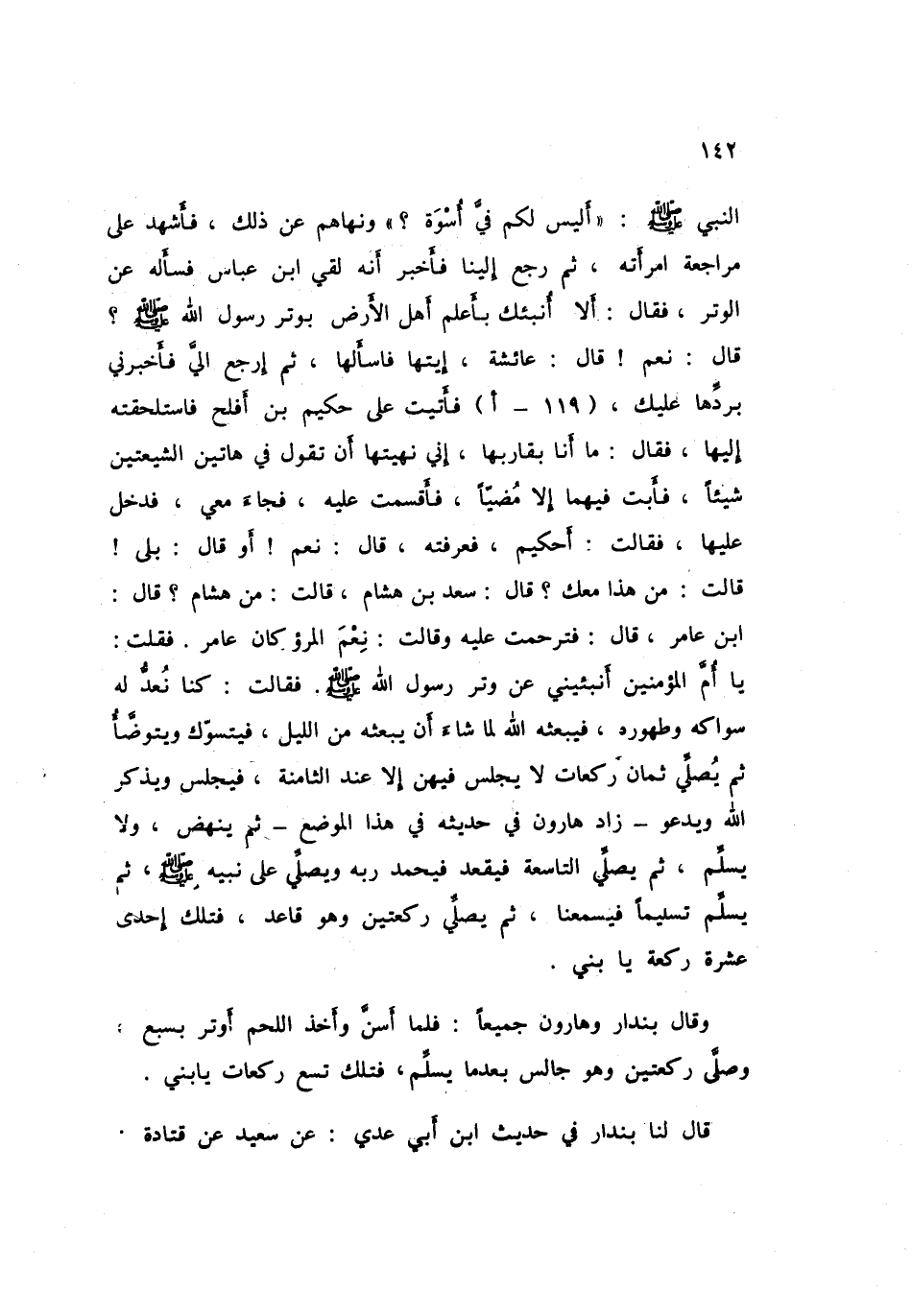 فَأَشْهَدَ عَلَى مُرَاجَعَةِ امْرَأَتِهِ ، ثُمَّ رَجَعَ إِلَيْنَا ، فَأَخْبَرَ أَنَّهُ لَقِيَ ابْنَ عَبَّاسٍ فَسَأَلَهُ عَنِ الْوِتْرِ ، فَقَالَ : أَلاَ أُنَبِّئُكَ بِأَعْلَمِ أَهْلِ الأَرْضِ بِوِتْرِ رَسُولِ اللهِ صَلَّى اللَّهُ عَلَيْهِ وَسَلَّمَ ؟ قَالَ : نَعَمْ ، قَالَ : عَائِشَةُ ايْتِهَا ، فَاسْأَلْهَا ، ثُمَّ ارْجِعْ إِلَيَّ فَأَخْبِرْنِي بِرَدِّهَا عَلَيْكَ ، فَأَتَيْتُ عَلَى حَكِيمِ بْنِ أَفْلَحَ فَاسْتَلْحَقْتُهُ إِلَيْهَا ، فَقَالَ : مَا أَنَا بِقَارِبِهَا إِنِّي نَهَيْتُهَا أَنْ تَقُولَ فِي هَاتَيْنِ الشِّيعَتَيْنِ شَيْئًا ، فَأَبَتْ فِيهِمَا إِلاَّ مُضِيًّا ، فَأَقْسَمْتُ عَلَيْهِ ، فَجَاءَ مَعِي فَدَخَلَ عَلَيْهَا ، فَقَالَتْ : أَحَكِيمٌ ؟ فَعَرَفَتْهُ ، قَالَ : نَعَمْ ، أَوْ ، قَالَ : بَلَى قَالَتَ : مَنْ هَذَا مَعَكَ ؟ قَالَ : سَعْدُ بْنُ هِشَامٍ قَالَتْ : مَنْ هِشَامٍ ؟ قَالَ : ابْنُ عَامِرٍ ، قَالَ : فَتَرَحَّمَتْ عَلَيْهِ ، وَقَالَتْ : نِعْمَ الْمَرْؤ كَانَ عَامِرٌ ، فَقُلْتُ : يَا أُمَّ الْمُؤْمِنِينَ ، أَنْبِئِينِي عَنْ وِتْرِ رَسُولِ اللهِ صَلَّى اللَّهُ عَلَيْهِ وَسَلَّمَ ، فَقَالَتْ : كُنَّا نَعُدُّ لَهُ سِوَاكَهُ ، وَطَهُورَهُ فَيَبْعَثُهُ اللَّهُ لِمَا شَاءَ أَنْ يَبْعَثَهُ مِنَ اللَّيْلِ ، فَيَتَسَوَّكُ ، وَيَتَوَضَّأُ ، ثُمَّ يُصَلِّي ثَمَانِ رَكَعَاتٍ ، لاَ يَجْلِسُ فِيهِنَّ إِلاَّ عِنْدَ الثَّامِنَةِ ، فَيَجْلِسُ وَيَذْكُرُ اللَّهَ وَيَدْعُو - زَادَ هَارُونُ فِي حَدِيثِهِ فِي هَذَا الْمَوْضِعِ - ثُمَّ يَنْهَضُ ، وَلاَ يُسَلِّمُ ، ثُمَّ يُصَلِّي التَّاسِعَةَ ، فَيَقْعُدُ فَيَحْمَدُ رَبَّهُ وَيُصَلِّي عَلَى نَبِيِّهِ صَلَّى اللَّهُ عَلَيْهِ وَسَلَّمَ ، ثُمَّ يُسَلِّمُ تَسْلِيمًا فَيُسْمِعُنَا ، ثُمَّ يُصَلِّي رَكْعَتَيْنِ وَهُوَ قَاعِدٌ فَتِلْكَ إِحْدَى عَشْرَةَ رَكْعَةً يَا بُنَيَّ.