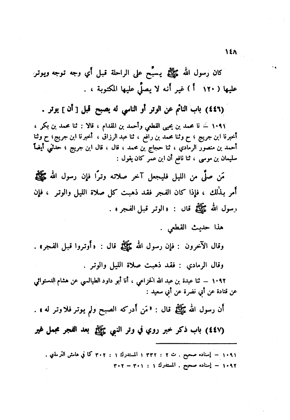 1091 - نا مُحَمَّدُ بْنُ يَحْيَى الْقُطَعِيُّ، وَأَحْمَدُ بْنُ الْمِقْدَامِ قَالَا: ثنا مُحَمَّدُ بْنُ بَكْرٍ، أَخْبَرَنَا ابْنُ جُرَيْجٍ، ح وَثنا مُحَمَّدُ بْنُ رَافِعٍ، ثنا عَبْدُ الرَّزَّاقِ، أَخْبَرَنَا ابْنُ جُرَيْجٍ، ح وَثنا أَحْمَدُ بْنُ مَنْصُورٍ الرَّمَادِيُّ، ثنا حَجَّاجُ بْنُ مُحَمَّدٍ قَالَ: قَالَ ابْنُ جُرَيْجٍ: حَدَّثَنِي أَيْضًا، سُلَيْمَانُ بْنُ مُوسَى، ثنا نَافِعٌ، أَنَّ ابْنَ عُمَرَ كَانَ يَقُولُ: §مَنْ صَلَّى مِنَ اللَّيْلِ فَلْيَجْعَلْ آخِرَ صَلَاتِهِ وِتْرًا؛ فَإِنَّ رَسُولَ اللَّهِ صَلَّى اللهُ عَلَيْهِ وَسَلَّمَ أَمْرَ بِذَلِكَ، فَإِذَا كَانَ الْفَجْرُ فَقَدْ ذَهَبَتْ كُلُّ صَلَاةِ اللَّيْلِ وَالْوِتْرُ؛ فَإِنَّ رَسُولَ اللَّهِ صَلَّى اللهُ عَلَيْهِ وَسَلَّمَ قَالَ: «الْوِتْرُ قَبْلَ الْفَجْرِ» هَذَا حَدِيثُ الْقُطَعِيِّ. وَقَالَ الْآخَرُونَ: فَإِنَّ رَسُولَ اللَّهِ صَلَّى اللهُ عَلَيْهِ وَسَلَّمَ قَالَ: «أَوْتِرُوا قَبْلَ الْفَجْرِ» . وَقَالَ الرَّمَادِيُّ: فَقَدْ ذَهَبَتْ صَلَاةُ اللَّيْلِ وَالْوِتْرُK1091 - قال الأعظمي: إسناده صحيح