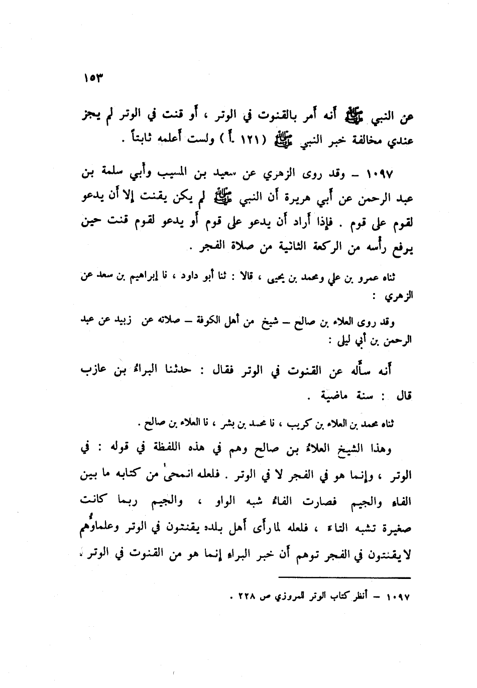 1097 - وَقَدْ رَوَى الزُّهْرِيُّ، عَنْ سَعِيدِ بْنِ الْمُسَيِّبِ، وَأَبِي سَلَمَةَ بْنِ عَبْدِ الرَّحْمَنِ عَنْ أَبِي هُرَيْرَةَ، أَنَّ النَّبِيَّ صَلَّى اللهُ عَلَيْهِ وَسَلَّمَ §لَمْ يَكُنْ يَقْنُتُ إِلَّا أَنْ يَدْعُوَ لِقَوْمٍ عَلَى قَوْمٍ، فَإِذَا أَرَادَ أَنْ يَدْعُوَ عَلَى قَوْمٍ أَوْ يَدْعُوَ لِقَوْمٍ، قَنَتَ حِينَ يَرْفَعُ رَأْسَهُ مِنَ الرَّكْعَةِ الثَّانِيَةِ مِنْ صَلَاةِ الْفَجْرِ ثناه عَمْرُو بْنُ عَلِيٍّ، وَمُحَمَّدُ بْنُ يَحْيَى قَالَا: ثنا أَبُو دَاوُدَ، نا إِبْرَاهِيمُ بْنُ سَعْدٍ، عَنِ الزُّهْرِيِّ: وَقَدْ رَوَى الْعَلَاءُ بْنُ صَالِحٍ - شَيْخٌ مِنْ أَهْلِ الْكُوفَةِ - صَلَاتَهُ عَنْ زُبَيْدٍ، عَنْ عَبْدِ الرَّحْمَنِ بْنِ أَبِي لَيْلَى، أَنَّهُ سَأَلَهُ عَنِ الْقُنُوتِ فِي الْوِتْرِ، فَقَالَ: حَدَّثَنَا الْبَرَاءُ بْنُ عَازِبٍ قَالَ: سُنَّةٌ مَاضِيَةٌ. ثناه مُحَمَّدُ بْنُ الْعَلَاءِ بْنُ كُرَيْبٍ، نا مُحَمَّدُ بْنُ بِشْرٍ، نا الْعَلَاءُ بْنُ صَالِحٍ. وَهَذَا الشَّيْخُ الْعَلَاءُ بْنُ صَالِحٍ وَهِمَ فِي هَذِهِ اللَّفْظَةِ فِي قَوْلِهِ: فِي الْوِتْرِ، وَإِنَّمَا هُوَ فِي الْفَجْرِ لَا فِي الْوِتْرِ، فَلَعَلَّهُ انْمَحَى مِنْ كِتَابِهِ مَا بَيْنَ الْفَاءِ وَالْجِيمِ فَصَارَتِ الْفَاءُ شِبْهَ الْوَاوِ، وَالْجِيمُ رُبَّمَا كَانَتْ صَغِيرَةً تُشْبِهُ التَّاءَ فَلَعَلَّهُ لَمَّا رَأَى أَهْلَ بَلَدِهِ يَقْنُتُونَ فِي الْوِتْرِ، وَعُلَمَاؤُهُمْ لَا يَقْنُتُونَ فِي الْفَجْرِ، تَوَهَّمَ أَنَّ خَبَرَ الْبَرَاءِ إِنَّمَا هُوَ مِنَ الْقُنُوتِ فِي الْوِتْرِ. نا سَلْمُ بْنُ جُنَادَةَ، نا وَكِيعٌ، عَنْ سُفْيَانَ عَنْ زُبَيْدٍ الْيَامِيِّ قَالَ: سَأَلْتُ عَبْدَ الرَّحْمَنِ بْنَ أَبِي لَيْلَى عَنِ الْقُنُوتِ فِي الْفَجْرِ، فَقَالَ: سُنَّةٌ مَاضِيَةٌ. فَسُفْيَانُ الثَّوْرِيُّ أَحْفَظُ مِنْ مِائَتَيْنِ مِثْلِ الْعَلَاءِ بْنِ صَالِحٍ، فَخُبِّرَ أَنَّ سُؤَالَ زُبَيْدِ بْنِ أَبِي لَيْلَى إِنَّمَا كَانَ عَنِ الْقُنُوتِ فِي الْفَجْرِ لَا فِي الْوِتْرِ، فَأَعْلَمَهُ أَنَّهُ سُنَّةٌ مَاضِيَةٌ، وَلَمْ يَذْكُرْ أَيْضًا الْبَرَاءَ. وَقَدْ رَوَى الثَّوْرِيُّ وَشُعْبَةُ - وهُمَا إِمَامَا أَهْلِ زَمَانِهِمَا فِي الْحَدِيثِ، - عَنْ عَمْرِو بْنِ مُرَّةَ، عَنْ عَبْدِ الرَّحْمَنِ بْنِ أَبِي لَيْلَى، عَنِ الْبَرَاءِ: أَنَّ النَّبِيَّ قَنَتَ فِي الْفَجْرِ