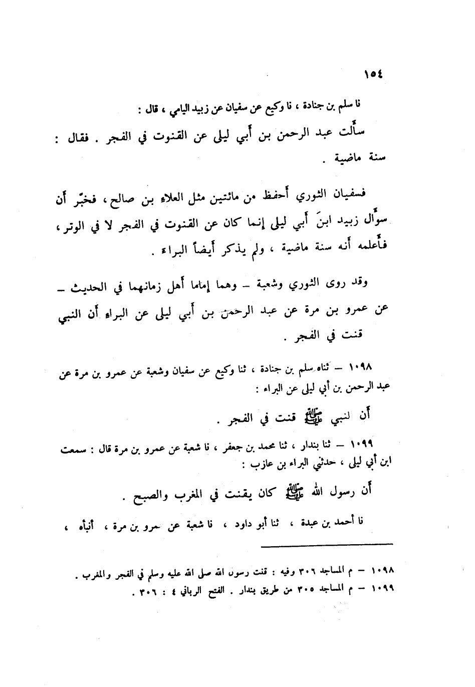 1098 - ثناه سَلْمُ بْنُ جُنَادَةَ، ثنا وَكِيعٌ، عَنْ سُفْيَانَ، وَشُعْبَةَ، عَنْ عَمْرِو بْنِ مُرَّةَ، عَنْ عَبْدِ الرَّحْمَنِ بْنِ أَبِي لَيْلَى، عَنِ الْبَرَاءِ، أَنَّ النَّبِيَّ صَلَّى اللهُ عَلَيْهِ وَسَلَّمَ: §قَنَتَ فِي الْفَجْرِ