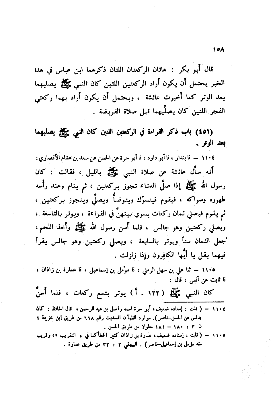 1105 - ثنا عَلِيُّ بْنُ سَهْلٍ الرَّمْلِيُّ، نا مُؤَمَّلُ بْنُ إِسْمَاعِيلَ، نا عُمَارَةُ بْنُ زَاذَانَ، نا ثَابِتٌ، عَنْ أَنَسٍ قَالَ: كَانَ النَّبِيُّ صَلَّى اللهُ عَلَيْهِ وَسَلَّمَ §يُوتِرُ بِتِسْعِ رَكَعَاتٍ، فَلَمَّا أَسَنَّ وَثَقُلَ أَوْتَرَ بِسَبْعٍ، وَصَلَّى رَكْعَتَيْنِ وَهُوَ جَالِسٌ، يَقْرَأُ بِ الرَّحْمَنِ، وَالْوَاقِعَةِ قَالَ أَنَسٌ: وَنَحْنُ نَقْرَأُ بِالسُّوَرِ الْقِصَارِ إِذَا زُلْزِلَتْ، وَقُلْ يَا أَيُّهَا الْكَافِرُونَ وَنَحْوِهِمَاK1105 - قال الألباني: إسناده ضعيف عمارة بن زاذان كثير الخطأ كما في التقريب وقريب منه مؤمل بن اسماعيل