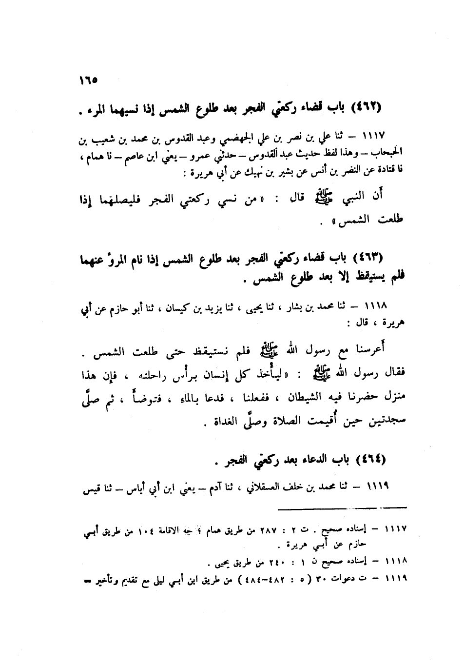 1117 - ثنا عَلِيُّ بْنُ نَصْرِ بْنِ عَلِيٍّ الْجَهْضَمِيُّ، وَعَبْدُ الْقُدُّوسِ بْنُ مُحَمَّدِ بْنِ شُعَيْبِ بْنِ الْحَبْحَابِ، - وَهَذَا لَفْظُ حَدِيثِ عَبْدِ الْقُدُّوسِ، - حَدَّثَنِي عَمْرٌو يَعْنِي ابْنَ عَاصِمٍ، نا هَمَّامٌ، نا قَتَادَةُ، عَنِ النَّضْرِ بْنِ أَنَسٍ، عَنْ بَشِيرِ بْنِ نَهِيكٍ، عَنْ أَبِي هُرَيْرَةَ، أَنَّ النَّبِيَّ صَلَّى اللهُ عَلَيْهِ وَسَلَّمَ قَالَ: «§مَنْ نَسِيَ رَكْعَتَيِ الْفَجْرَ، فَلْيُصَلِّهِمَا إِذَا طَلَعَتِ الشَّمْسُ» K1117 - قال الأعظمي: إسناده صحيح