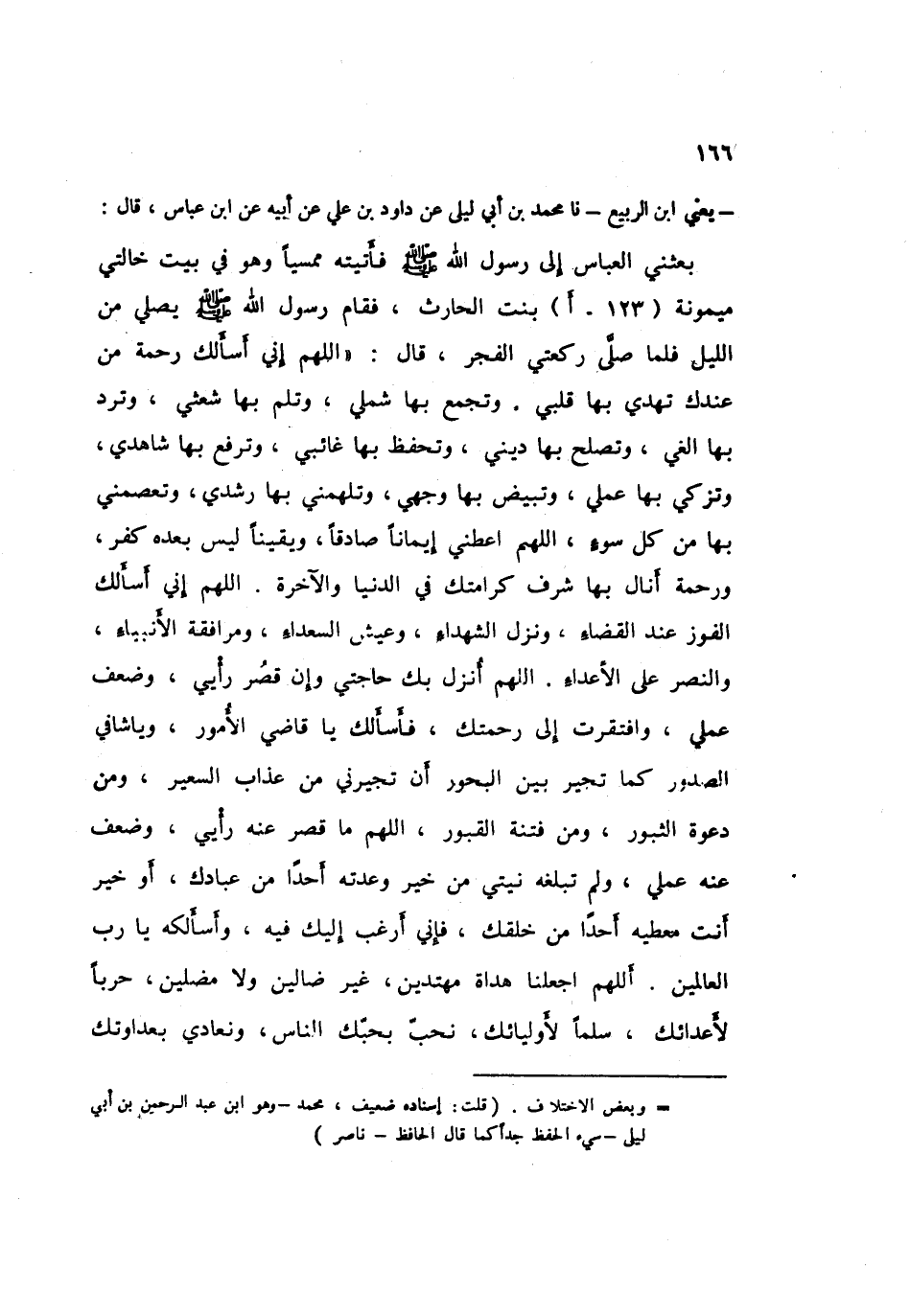حَدَّثَنَا مُحَمَّدُ بْنُ أَبِي لَيْلَى ، عَنْ دَاوُدَ بْنِ عَلِيٍّ ، عَنْ أَبِيهِ ، عَنِ ابْنِ عَبَّاسٍ ، قَالَ : بَعَثَنِي الْعَبَّاسُ إِلَى رَسُولِ اللهِ صَلَّى اللَّهُ عَلَيْهِ وَسَلَّمَ فَأَتَيْتُهُ مُمْسِيًا ، وَهُوَ فِي بَيْتِ خَالَتِي مَيْمُونَةَ بِنْتِ الْحَارِثِ ، فَقَامَ رَسُولُ اللهِ صَلَّى اللَّهُ عَلَيْهِ وَسَلَّمَ يُصَلِّي مِنَ اللَّيْلِ ، فَلَمَّا صَلَّى رَكْعَتَيِ الْفَجْرِ ، قَالَ : اللَّهُمَّ إِنِّي أَسْأَلُكَ رَحْمَةً مِنْ عِنْدِكَ تَهْدِي بِهَا قَلْبِي ، وَتَجْمَعُ بِهَا شَمْلِي ، وَتَلُمُّ بِهَا شَعْثِي ، وَتَرُدُّ بِهَا الْغَيَّ ، وَتُصْلِحُ بِهَا دِينِي ، وَتَحْفَظُ بِهَا غَائِبِي ، وَتَرْفَعُ بِهَا شَاهِدِي ، وَتُزَكِّي بِهَا عَمَلِي ، وَتُبَيِّضَ بِهَا وَجْهِي ، وَتُلْهِمُنِي بِهَا رُشْدِي ، وَتَعْصِمُنِي بِهَا مِنْ كُلِّ سَوْءٍ ، اللَّهُمَّ أَعْطِنِي إِيمَانًا صَادِقًا ، وَيَقِينًا لَيْسَ بَعْدَهُ كُفْرٌ ، وَرَحْمَةً أَنَالُ بِهَا شَرَفَ كَرَامَتِكَ فِي الدُّنْيَا وَالآخِرَةِ ، اللَّهُمَّ إِنِّي أَسْأَلُكَ الْفَوْزَ عِنْدَ الْقَضَاءِ ، وَنُزُلَ الشُّهَدَاءِ ، وَعَيْشَ السُّعَدَاءِ ، وَمُرَافَقَةَ الأَنْبِيَاءِ ، وَالنَّصْرَ عَلَى الأَعْدَاءِ ، اللَّهُمَّ أُنْزِلُ بِكَ حَاجَتِي ، وَإِنْ قَصُرَ رَأْيِي ، وَضَعُفَ عَمَلِي ، وَافْتَقَرْتُ إِلَى رَحْمَتِكَ ، فَأَسْأَلُكَ يَا قَاضِيَ الأُمُورِ ، وَيَا شَافِيَ الصُّدُورِ ، كَمَا تُجِيرُ بَيْنَ الْبُحُورِ أَنْ تُجِيرَنِي مِنْ عَذَابِ السَّعِيرِ ، وَمِنْ دَعْوَةِ الثُّبُورِ ، وَمَنْ فِتْنَةِ الْقُبُورِ ، اللَّهُمَّ مَا قَصُرَ عَنْهُ رَأْيِي ، وَضَعُفَ عَنْهُ عَمَلِي ، وَلَمْ تَبْلُغْهُ نِيَّتِي مِنْ خَيْرٍ وَعَدْتَهُ أَحَدًا مِنْ عِبَادِكَ ، أَوْ خَيْرٍ أَنْتَ مُعْطِيهِ أَحَدًا مِنْ خَلْقِكَ ، فَإِنِّي أَرْغَبُ إِلَيْكَ فِيهِ ، وَأَسْأَلُكَ يَا رَبَّ الْعَالَمِينَ ، اللَّهُمَّ اجْعَلْنَا هُدَاةً مُهْتَدِينَ غَيْرَ ضَالِّينَ وَلاَ مُضِلِّينَ ، حَرْبًا لأَعْدَائِكَ ، سِلْمًا لأَوْلِيَائِكَ ، نُحِبُّ بِحُبِّكَ النَّاسَ ، وَنُعَادِي بِعَدَاوَتِكَ مَنْ خَالَفَكَ ، اللَّهُمَّ هَذَا الدُّعَاءُ وَعَلَيْكَ الاِسْتِجَابَةُ ، أَوِ الإِِجَابَةُ -