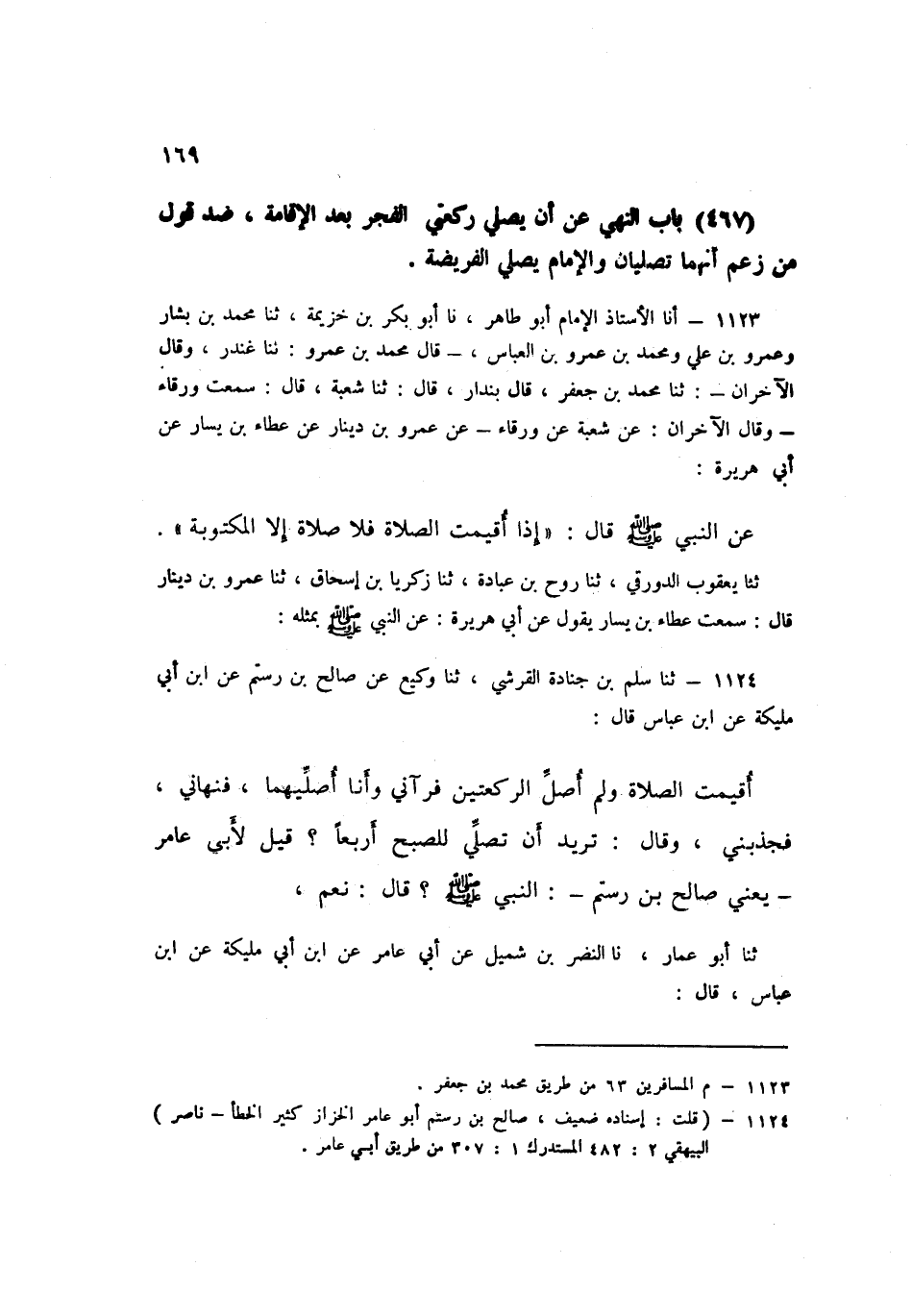 1124 - ثنا سَلْمُ بْنُ جُنَادَةَ الْقُرَشِيُّ، ثنا وَكِيعٌ، عَنْ صَالِحِ بْنِ رُسْتُمَ، عَنِ ابْنِ أَبِي مُلَيْكَةَ، عَنِ ابْنِ عَبَّاسٍ قَالَ: §أُقِيمَتِ الصَّلَاةُ وَلَمْ أُصَلِّ الرَّكْعَتَيْنِ، فَرَآنِي وَأَنَا أُصَلِّيهِمَا، فَنَهَانِي فَجَذَبَنِي، وَقَالَ: " تُرِيدُ أَنْ تُصَلِّيَ لِلصُّبْحِ أَرْبَعًا؟ قِيلَ لِأَبِي عَامِرٍ يَعْنِي صَالِحَ بْنَ رُسْتُمَ: النَّبِيُّ صَلَّى اللهُ عَلَيْهِ وَسَلَّمَ؟ قَالَ: نَعَمْ ثنا أَبُو عَمَّارٍ: نا النَّضْرُ بْنُ شُمَيْلٍ، عَنْ أَبِي عَامِرٍ، عَنِ ابْنِ أَبِي مُلَيْكَةَ، عَنِ ابْنِ عَبَّاسٍ قَالَ: أُقِيمَتِ الصَّلَاةُ فَقُمْتُ أُصَلِّي رَكْعَتَيْنِ، فَجَذَبَنِي رَسُولُ اللَّهِ صَلَّى اللهُ عَلَيْهِ وَسَلَّمَ، وَقَالَ: «أَتُصَلِّي الْغَدَاةَ أَرْبَعًا» K1124 - قال الألباني: إسناده ضعيف صالح بن رستم أبو عامر الخزاز كثير الخطأ