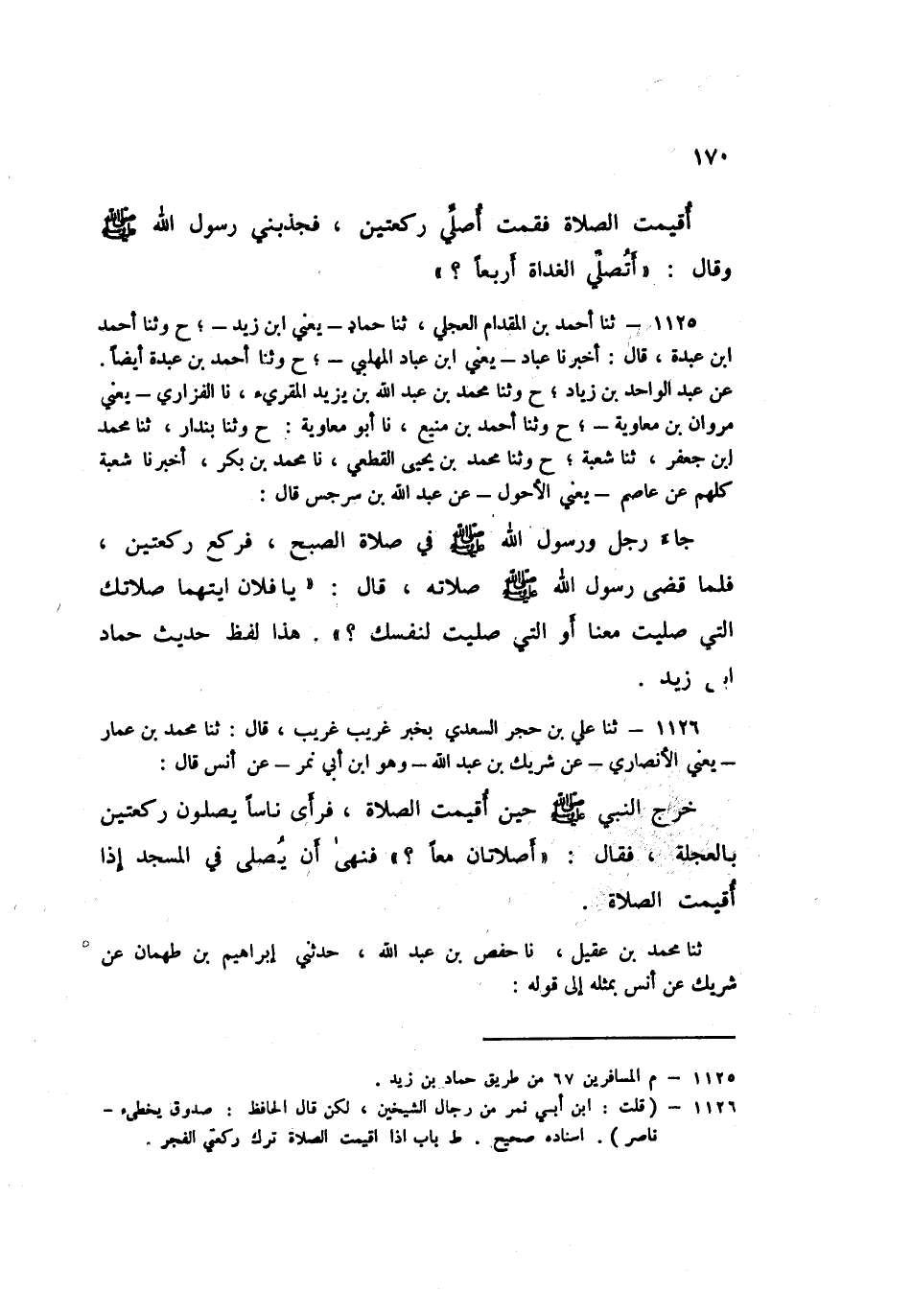 1126 - ثنا عَلِيُّ بْنُ حُجْرٍ السَّعْدِيُّ بِخَبَرِ غَرِيبٍ غَرِيبٍ قَالَ: ثنا مُحَمَّدُ بْنُ عَمَّارٍ يَعْنِي الْأَنْصَارِيَّ، عَنْ شَرِيكِ بْنِ عَبْدِ اللَّهِ وَهُوَ ابْنُ أَبِي نَمِرٍ، عَنْ أَنَسٍ قَالَ: خَرَجَ النَّبِيُّ صَلَّى اللهُ عَلَيْهِ وَسَلَّمَ حِينَ أُقِيمَتِ الصَّلَاةُ فَرَأَى نَاسًا يُصَلُّونَ رَكْعَتَيْنِ بِالْعَجَلَةِ، فَقَالَ: «§أَصَلَاتَانِ مَعًا» ، فَنَهَى أَنْ يُصَلَّى فِي الْمَسْجِدِ إِذَا أُقِيمَتِ الصَّلَاةُ. ثنا مُحَمَّدُ بْنُ عُقَيْلٍ، نا حَفْصُ بْنُ عَبْدِ اللَّهِ، حَدَّثَنِي إِبْرَاهِيمُ بْنُ طَهْمَانَ، عَنْ شَرِيكٍ، عَنْ أَنَسٍ بِمِثْلِهِ إِلَى قَوْلِهِ: «أَصَلَاتَانِ مَعًا» ، لَمْ يَزِدْ عَلَى هَذَا. قَالَ مُحَمَّدُ بْنُ إِسْحَاقَ: رَوَى هَذَا الْخَبَرَ مَالِكُ بْنُ أَنَسٍ، وَإِسْمَاعِيلُ بْنُ جَعْفَرٍ، عَنْ شَرِيكِ بْنِ أَبِي نَمِرٍ، عَنْ أَبِي سَلَمَةَ مُرْسَلًا، وَرَوَى إِبْرَاهِيمُ بْنُ طَهْمَانَ، عَنْ شَرِيكٍ كِلَا الْخَبَرَيْنِ عَنْ أَنَسٍ وَعَنْ أَبِي سَلَمَةَ جَمِيعًا. حَدَّثَنَا بِهِمَا مُحَمَّدُ بْنُ عُقَيْلٍ، ثنا حَفْصُ بْنُ عَبْدِ اللَّهِ، نا إِبْرَاهِيمُ بْنُ طَهْمَانَ بِالْإِسْنَادَيْنِ جَمِيعًا مُنْفَرِدَيْنِ، خَبَرُ أَنَسٍ مُنْفَرِدًا، وَخَبَرُ ابْنِ سَلَمَةَ مُنْفَرِدًاK1126 - قال الأعظمي: إسناده صحيح