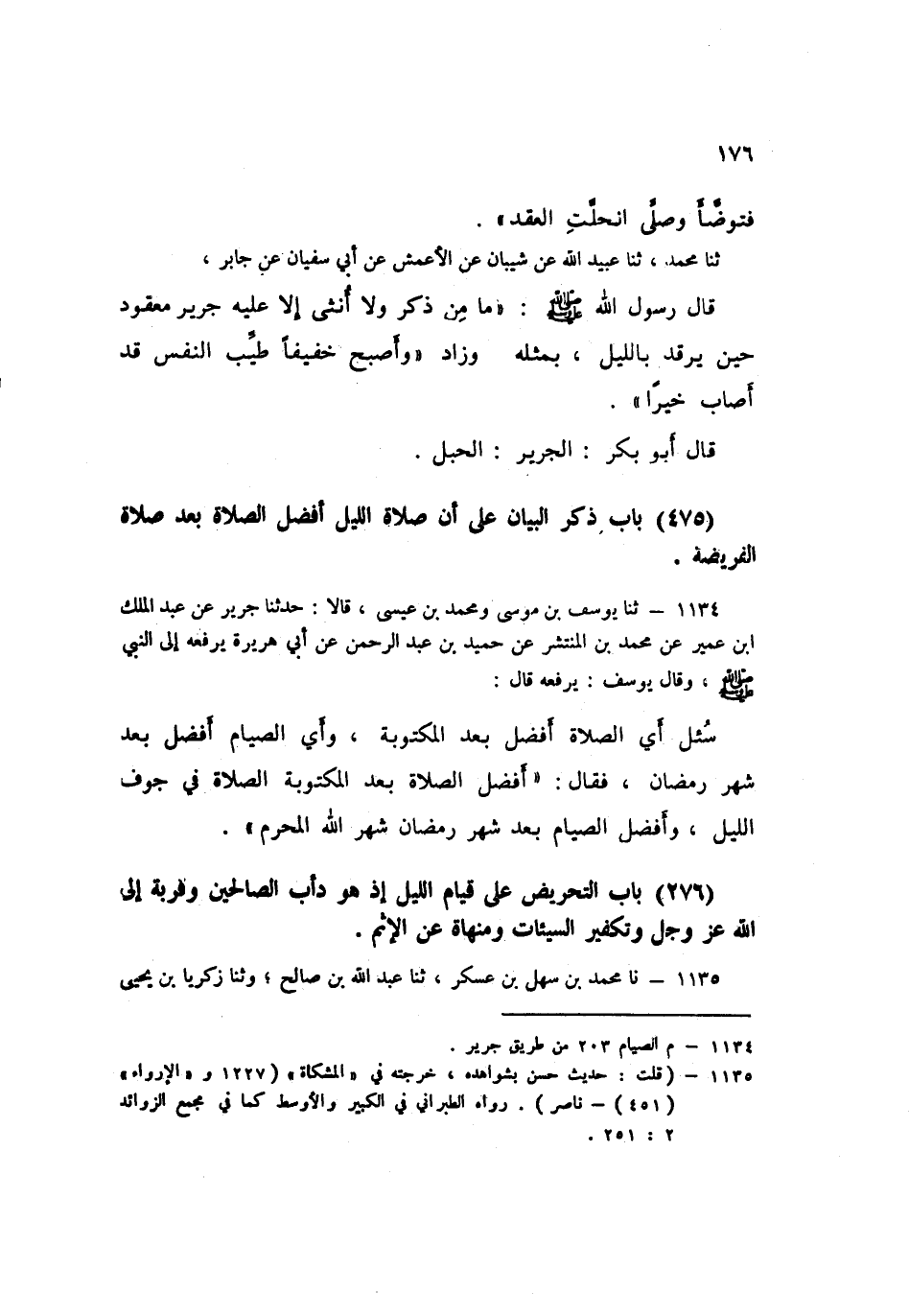 1134 - ثنا يُوسُفُ بْنُ مُوسَى، وَمُحَمَّدُ بْنُ عِيسَى قَالَا: حَدَّثَنَا جَرِيرٌ، عَنْ عَبْدِ الْمَلَكِ بْنِ عُمَيْرٍ، عَنْ مُحَمَّدِ بْنِ الْمُنْتَشِرِ، عَنْ حُمَيْدِ بْنِ عَبْدِ الرَّحْمَنِ، عَنْ أَبِي هُرَيْرَةَ، يَرْفَعُهُ إِلَى النَّبِيِّ صَلَّى اللهُ عَلَيْهِ وَسَلَّمَ، - وَقَالَ يُوسُفُ: يَرْفَعُهُ - قَالَ: سُئِلَ §أَيُّ صَلَاةٍ أَفْضَلُ بَعْدَ الْمَكْتُوبَةِ؟ وَأَيُّ الصِّيَامِ أَفْضَلُ بَعْدَ شَهْرِ رَمَضَانَ؟ فَقَالَ: «أَفْضَلُ الصَّلَاةِ بَعْدَ الْمَكْتُوبَةِ الصَّلَاةُ فِي جَوْفِ اللَّيْلِ، وَأَفْضَلُ الصِّيَامِ بَعْدَ شَهْرِ رَمَضَانَ شَهْرُ اللَّهِ الْمُحَرَّمُ»