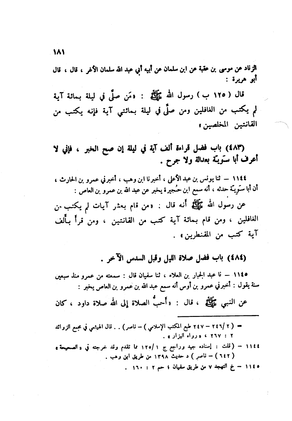1144 - ثنا يُونُسُ بْنُ عَبْدِ الْأَعْلَى، أَخْبَرَنَا ابْنُ وَهْبٍ، أَخْبَرَنِي عَمْرُو بْنُ الْحَارِثِ، أَنَّ أَبَا سَوِيَّةَ، حَدَّثَهُ أَنَّهُ سَمِعَ ابْنَ حُجَيْرَةَ يُخْبِرُ عَنْ عَبْدِ اللَّهِ بْنِ عَمْرِو بْنِ الْعَاصِ: عَنْ رَسُولِ اللَّهِ صَلَّى اللهُ عَلَيْهِ وَسَلَّمَ أَنَّهُ قَالَ: «§مَنْ قَامَ بِعَشْرِ آيَاتٍ لَمْ يُكْتَبْ مِنَ الْغَافِلِينَ، وَمَنْ قَامَ بِمِائَةِ آيَةٍ كُتِبَ مِنَ الْقَانِتِينَ، وَمَنَ قَرَأَ بِأَلْفِ آيَةٍ كُتِبَ مِنَ الْمُقَنْطِرِينَ» K1144 - قال الألباني: إسناده جيد