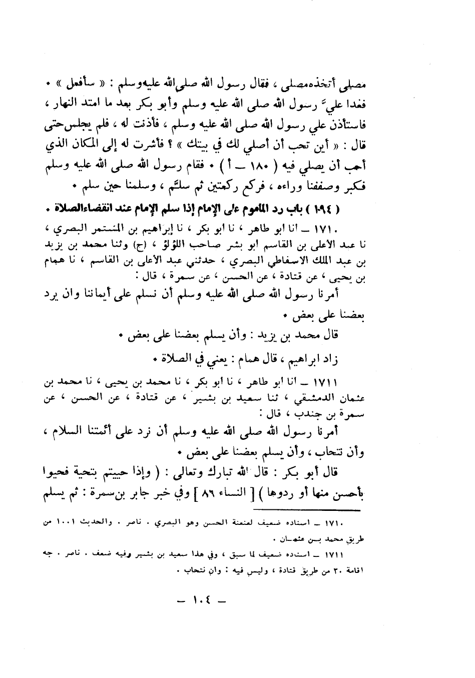 1710 - نا إِبْرَاهِيمُ بْنُ الْمُسْتَمِرِّ الْبَصْرِيُّ، نا عَبْدُ الْأَعْلَى بْنُ الْقَاسِمِ أَبُو بِشْرٍ صَاحِبُ اللُّؤْلُؤِ، ح، وَثنا مُحَمَّدُ بْنُ يَزِيدَ بْنِ عَبْدِ الْمَلِكِ الْأَسْفَاطِيُّ الْبَصْرِيُّ، حَدَّثَنِي عَبْدُ الْأَعْلَى بْنُ الْقَاسِمِ، نا هَمَّامُ بْنُ يَحْيَى، عَنْ قَتَادَةَ، عَنِ الْحَسَنِ، عَنْ سَمُرَةَ قَالَ: «§أَمَرَنَا رَسُولُ اللَّهِ صَلَّى اللهُ عَلَيْهِ وَسَلَّمَ أَنْ نُسَلِّمَ عَلَى أَيْمَانِنَا , وَأَنْ يَرُدَّ بَعْضُنَا عَلَى بَعْضٍ» . قَالَ مُحَمَّدُ بْنُ يَزِيدَ: وَأَنْ يُسَلِّمَ بَعْضُنَا عَلَى بَعْضٍ. زَادَ إِبْرَاهِيمُ: قَالَ هَمَّامٌ: يَعْنِي فِي الصَّلَاةِK1710 - قال الألباني: إسناده ضعيف لعنعنة الحسن وهو البصري