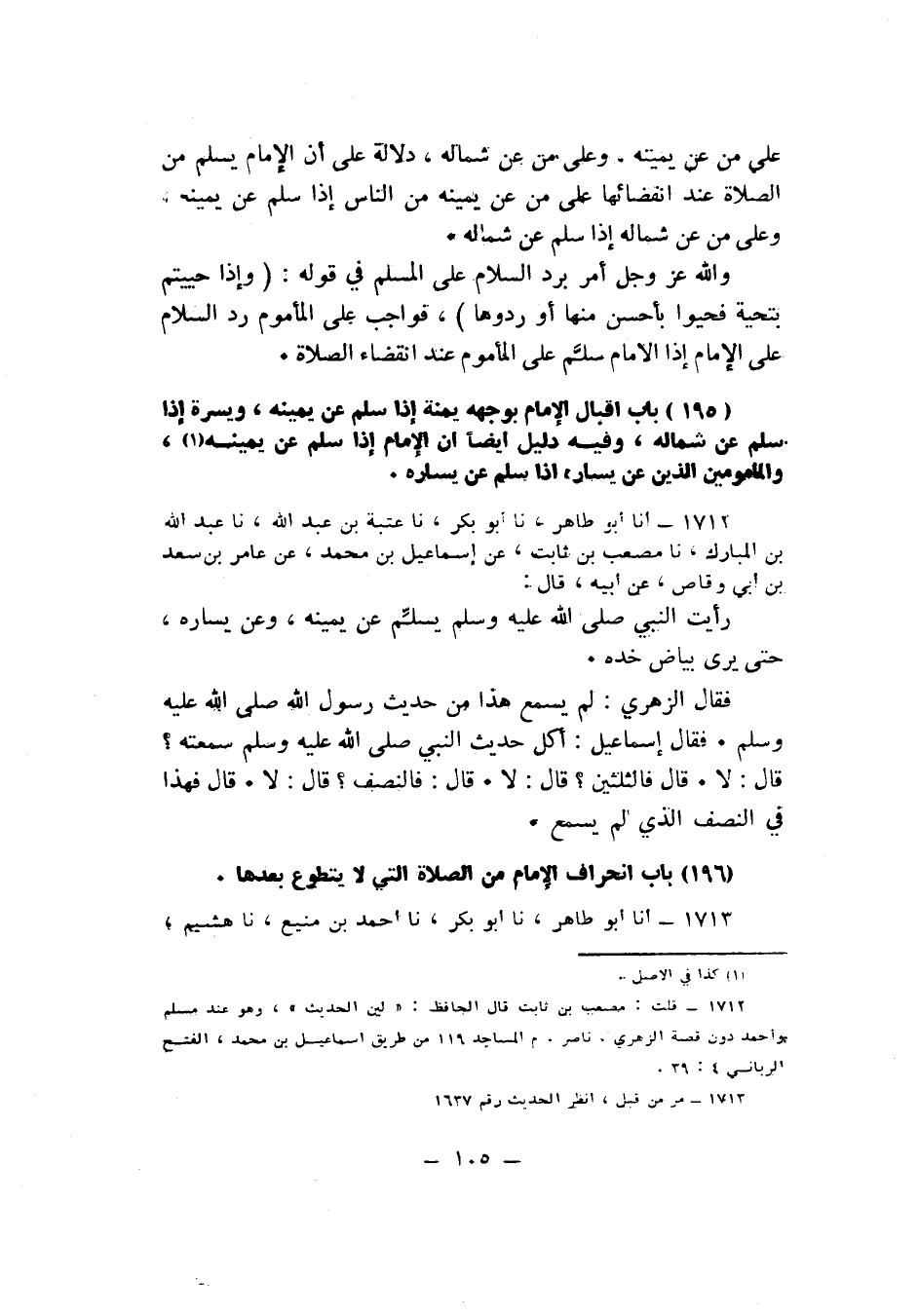 1712 - نا عُتْبَةُ بْنُ عَبْدِ اللَّهِ، نا عَبْدُ اللَّهِ بْنُ الْمُبَارَكِ، نا مُصْعَبُ بْنُ ثَابِتٍ، عَنْ إِسْمَاعِيلَ بْنِ مُحَمَّدٍ، عَنْ عَامِرِ بْنِ سَعْدِ بْنِ أَبِي وَقَّاصٍ، عَنْ أَبِيهِ قَالَ: «رَأَيْتُ النَّبِيَّ صَلَّى اللهُ عَلَيْهِ وَسَلَّمَ §يُسَلِّمُ عَنْ يَمِينِهِ , وَعَنْ يَسَارِهِ حَتَّى يُرَى بَيَاضُ خَدِّهِ» فَقَالَ الزُّهْرِيُّ: «لَمْ يُسْمَعْ هَذَا مِنْ حَدِيثِ رَسُولِ اللَّهِ صَلَّى اللهُ عَلَيْهِ وَسَلَّمَ» فَقَالَ إِسْمَاعِيلُ: " أَكُلُّ حَدِيثِ النَّبِيِّ صَلَّى اللهُ عَلَيْهِ وَسَلَّمَ سَمِعْتَهُ؟ قَالَ: لَا , قَالَ: فَالثُّلُثَيْنِ؟ قَالَ: لَا , قَالَ: فَالنِّصْفَ؟ قَالَ: لَا , قَالَ: فَهَذَا فِي النِّصْفِ الَّذِي لَمْ تَسْمَعْ "K1712 - قال الألباني: مصعب بن ثابت قال الحافظ: لين الحديث. وهو عند مسلم وأحمد دون قصة الزهري