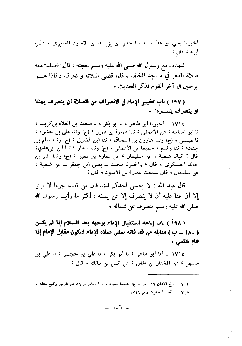 1714 - نا مُحَمَّدُ بْنُ الْعَلَاءِ بْنِ كُرَيْبٍ، نا أَبُو أُسَامَةَ، عَنِ الْأَعْمَشِ، ثنا عُمَارَةُ بْنُ عُمَيْرٍ، ح، وَثنا عَلِيُّ بْنُ خَشْرَمٍ، نا عِيسَى، ح، وَثنا هَارُونُ بْنُ إِسْحَاقَ، ثنا ابْنُ فُضَيْلٍ، ح، وَثنا سَلْمُ بْنُ جُنَادَةَ، ثنا وَكِيعٌ جَمِيعًا، عَنِ الْأَعْمَشِ، ح وَثنا بُنْدَارٌ، ثنا ابْنُ أَبِي عَدِيٍّ قَالَ: أَنْبَأَنَا شُعْبَةُ، عَنْ سُلَيْمَانَ، عَنْ عُمَارَةَ بْنِ عُمَيْرٍ، ح وَثنا بِشْرُ بْنُ خَالِدٍ الْعَسْكَرِيُّ قَالَ: وَأَخْبَرَنَا مُحَمَّدٌ يَعْنِي ابْنَ جَعْفَرٍ، عَنْ شُعْبَةَ، عَنْ سُلَيْمَانَ قَالَ: سَمِعْتُ عُمَارَةَ، عَنِ الْأَسْوَدِ قَالَ: قَالَ عَبْدُ اللَّهِ: «§لَا يَجْعَلَنَّ أَحَدُكُمْ لِلشَّيْطَانِ مِنْ نَفْسِهِ جُزْءًا , لَا يَرَى إِلَّا أَنَّ حَقًّا عَلَيْهِ أَنْ لَا يَنْصَرِفَ إِلَّا عَنْ يَمِينِهِ , أَكْثَرُ مَا رَأَيْتُ رَسُولَ اللَّهِ صَلَّى اللهُ عَلَيْهِ وَسَلَّمَ يَنْصَرِفُ عَنْ شِمَالِهِ»