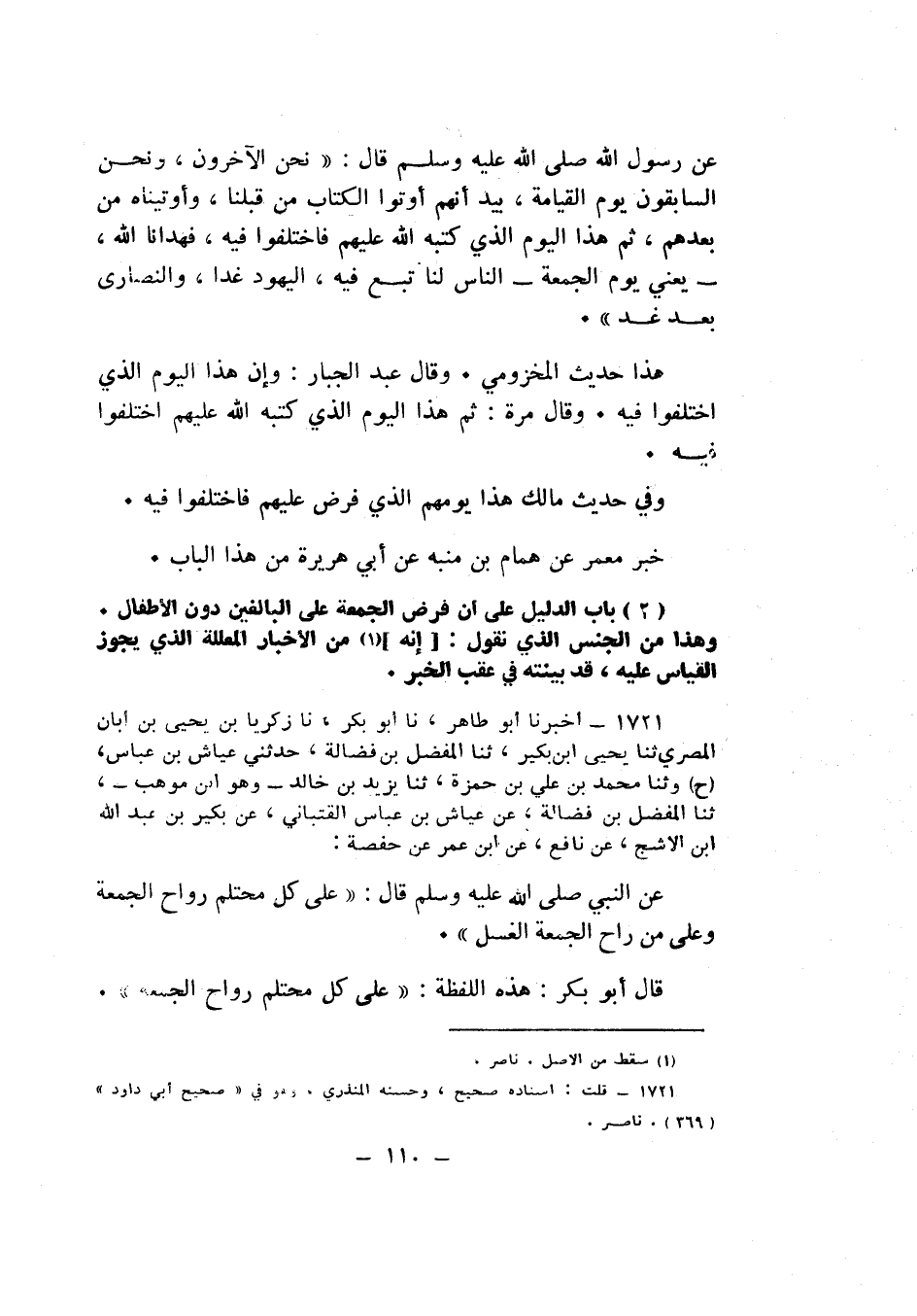 1721 - نا زَكَرِيَّا بْنُ يَحْيَى بْنِ أَبَانَ الْمِصْرِيُّ، ثنا يَحْيَى بْنُ بُكَيْرٍ، ثنا الْمُفَضَّلُ بْنُ فَضَالَةَ، حَدَّثَنِي عَيَّاشُ بْنُ عَبَّاسٍ، ح، وَثنا مُحَمَّدُ بْنُ عَلِيِّ بْنِ حَمْزَةَ، ثنا يَزِيدُ بْنُ خَالِدٍ وَهُوَ ابْنُ مَوْهَبٍ , ثنا الْمُفَضَّلُ بْنُ فَضَالَةَ، عَنْ عَيَّاشِ بْنِ عَبَّاسٍ الْقِتْبَانِيِّ، عَنْ بُكَيْرِ بْنِ عَبْدِ اللَّهِ بْنِ الْأَشَجِّ، عَنْ نَافِعٍ، عَنِ ابْنِ عُمَرَ، عَنْ حَفْصَةَ، عَنِ النَّبِيِّ صَلَّى اللهُ عَلَيْهِ وَسَلَّمَ قَالَ: «§عَلَى كُلِّ مُحْتَلِمٍ رَوَاحُ الْجُمُعَةِ , وَعَلَى مَنْ رَاحَ الْجُمُعَةَ الْغُسْلُ» قَالَ أَبُو بَكْرٍ: هَذِهِ اللَّفْظَةُ: «عَلَى كُلِّ مُحْتَلِمٍ رَوَاحُ الْجُمُعَةِ» مِنَ اللَّفْظِ الَّذِي نَقُولُ: إِنَّ الْأَمْرَ إِذَا كَانَ لِعِلَّةٍ فَالتَّمْثِيلُ وَالتَّشْبِيهُ بِهِ جَائِزٌ مَتَى كَانَتِ الْعِلَّةُ قَائِمَةً فَالْأَمْرُ وَاجِبٌ؛ لِأَنَّ النَّبِيَّ صَلَّى اللهُ عَلَيْهِ وَسَلَّمَ إِنَّمَا عَلَّمَ أَنَّ عَلَى الْمُحْتَلِمِ رَوَاحَ الْجُمُعَةِ؛ لِأَنَّ الِاحْتِلَامَ بُلُوغٌ , فَمَتَى كَانَ الْبُلُوغُ وَإِنْ لَمْ يَكُنِ احْتِلَامٌ وَكَانَ الْبُلُوغُ بِغَيْرِ احْتِلَامٍ , فَفَرْضُ الْجُمُعَةِ وَاجِبٌ عَلَى كُلِّ بَالِغٍ وَإِنْ كَانَ بُلُوغُهُ بِغَيْرِ احْتِلَامٍ , وَلَوْ كَانَ عَلَى غَيْرِ أَصْلِنَا وَكَانَ عَلَى أَصْلِ مَنْ خَالَفَنَا فِي التَّشْبِيهِ وَالتَّمْثِيلِ , وَزَعَمَ أَنَّ الْأَمْرَ لَا يَكُونُ لِعِلَّةٍ , وَلَا يَكُونُ إِلَّا تَعَبُّدًا , لَكَانَ مَنْ بَلَغَ عِشْرِينَ سَنَةً وَثَلَاثِينَ سَنَةً وَهُوَ حَرٌّ عَاقِلٌ , فَسَمِعَ الْأَذَانَ لِلْجُمُعَةِ فِي الْمِصْرِ أَوْ هُوَ عَلَى بَابِ الْمَسْجِدِ لَمْ يَجِبْ عَلَيْهِ رَوَاحُ الْجُمُعَةِ إِنْ لَمْ يَكُنِ احْتَلَمَ؛ لِأَنَّ النَّبِيَّ صَلَّى اللهُ عَلَيْهِ وَسَلَّمَ أَعْلَمَ أَنَّ رَوَاحَ الْجُمُعَةِ عَلَى الْمُحْتَلِمِ , وَقَدْ يَعِيشُ كَثِيرٌ مِنَ النَّاسِ السِّنِينَ الْكَثِيرَةَ فَلَا يَحْتَلِمُ أَبَدًا , وَهَذَا كَقَوْلِهِ عَزَّ وَجَلَّ: {وَإِذَا بَلَغَ الْأَطْفَالُ مِنْكُمُ الْحُلُمَ فَلْيَسْتَأْذِنُوا كَمَا اسْتَأْذَنَ الَّذِينَ مِنْ قَبْلِهِمْ} [النور: 59] ، فَإِنَّمَا أَمَرَ اللَّهُ عَزَّ وَجَلَّ بِالِاسْتِئْذَانِ مَنْ قَدْ بَلَغَ الْحُلُمَ , إِذِ الْحُلُمُ بُلُوغٌ , وَلَوْ لَمْ يَجُزِ الْحُكْمُ بِالتَّشْبِيهِ وَالنَّظِيرِ كَانَ مَنْ بَلَغَ ثَلَاثِينَ سَنَةً وَلَمْ يَحْتَلِمْ لَمْ يَجِبْ عَلَيْهِ الِاسْتِئْذَانُ، وَهَذَا كَخَبَرِ النَّبِيِّ صَلَّى اللهُ عَلَيْهِ وَسَلَّمَ: «رُفِعَ الْقَلَمُ عَنْ ثَلَاثَةٍ» , قَالَ فِي الْخَبَرِ: «وَعَنِ الصَّبِيِّ حَتَّى يَحْتَلِمَ» , وَمَنْ لَمْ يَحْتَلِمْ وَبَلَغَ مِنَ السِّنِّ مَا يَكُونُ إِدْرَاكًا مِنْ غَيْرِ احْتِلَامٍ فَالْقَلَمُ عَنْهُ غَيْرُ مَرْفُوعٍ , إِذِ النَّبِيُّ صَلَّى اللهُ عَلَيْهِ وَسَلَّمَ إِنَّمَا أَرَادَ بِقَوْلِهِ: «حَتَّى يَحْتَلِمَ» : أَنَّ الِاحْتِلَامَ بُلُوغٌ , فَمَتَى كَانَ الْبُلُوغُ - وَإِنْ كَانَ بِغَيْرِ احْتِلَامٍ - فَالْحُكْمُ عَلَيْهِ , وَالْقَلَمُ جَارٍ عَلَيْهِ , كَمَا يَكُونُ بَعْدَ الِاحْتِلَامِK1721 - قال الألباني: إسناده صحيح وحسنه المنذري