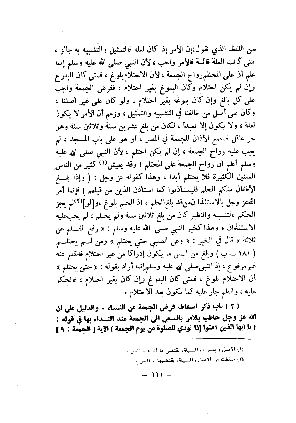 §بَابُ ذِكْرِ إِسْقَاطِ فَرْضِ الْجُمُعَةِ عَنِ النِّسَاءِ، وَالدَّلِيلِ عَلَى أَنَّ اللَّهَ عَزَّ وَجَلَّ خَاطَبَ بِالْأَمْرِ بِالسَّعْيِ إِلَى الْجُمُعَةِ عِنْدَ النِّدَاءِ بِهَا فِي قَوْلِهِ: {يَا أَيُّهَا الَّذِينَ آمَنُوا إِذَا نُودِيَ لِلصَّلَاةِ مِنْ يَوْمِ الْجُمُعَةِ} [الجمعة: 9] الْآيَةَ، الرِّجَالَ دُونَ النِّسَاءِ إِنْ ثَبَتَ هَذَا الْخَبَرُ مِنْ جِهَةِ النَّقْلِ، وَإِنْ لَمْ يَثْبُتْ فَاتِّفَاقُ الْعُلَمَاءِ عَلَى إِسْقَاطِ فَرْضِ الْجُمُعَةِ عَنِ النِّسَاءِ كَافٍ مِنْ نَقْلِ خَبَرِ الْخَاصِّ فِيهِ