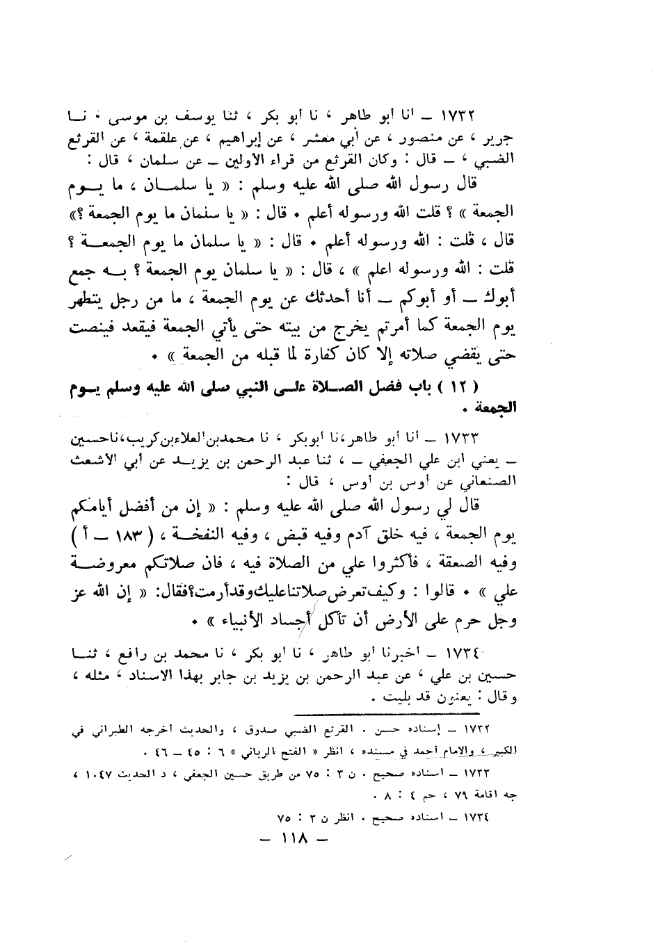 1733 - نا مُحَمَّدُ بْنُ الْعَلَاءِ بْنِ كُرَيْبٍ، نا حُسَيْنٌ يَعْنِي ابْنَ عَلِيٍّ الْجُعْفِيَّ، ثنا عَبْدُ الرَّحْمَنِ بْنُ يَزِيدَ، عَنْ أَبِي الْأَشْعَثِ الصَّنْعَانِيِّ، عَنْ أَوْسِ بْنِ أَوْسٍ قَالَ: قَالَ لِي رَسُولُ اللَّهِ صَلَّى اللهُ عَلَيْهِ وَسَلَّمَ: «إِنَّ §مِنْ أَفْضَلِ أَيَّامِكُمْ يَوْمَ الْجُمُعَةِ , فِيهِ خُلِقَ آدَمُ , وَفِيهِ قُبِضَ , وَفِيهِ النَّفْخَةُ , وَفِيهِ الصَّعْقَةُ , فَأَكْثِرُوا عَلَيَّ مِنَ الصَّلَاةِ فِيهِ , فَإِنَّ صَلَاتَكُمْ مَعْرُوضَةٌ عَلَيَّ» , قَالُوا: وَكَيْفَ تُعْرَضُ صَلَاتُنَا عَلَيْكَ وَقَدْ أَرِمْتَ؟ فَقَالَ: «إِنَّ اللَّهَ عَزَّ وَجَلَّ حَرَّمَ عَلَى الْأَرْضِ أَنْ تَأْكُلَ أَجْسَادَ الْأَنْبِيَاءِ» ، K1733 - قال الأعظمي: إسناده صحيح