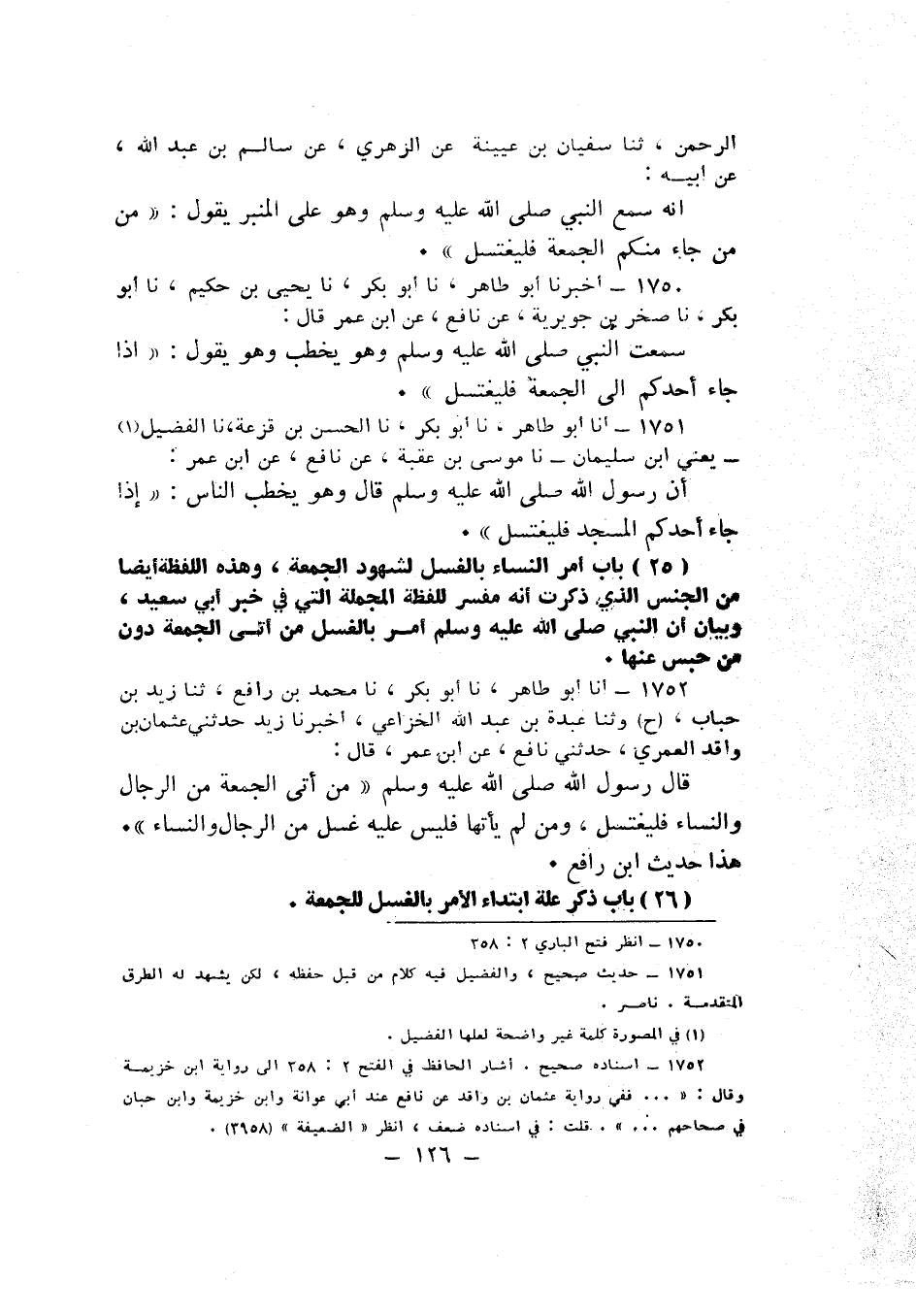 1751 - نا الْحَسَنُ بْنُ قَزْعَةَ، نا الْفُضَيْلُ يَعْنِي ابْنَ سُلَيْمَانَ، نا مُوسَى بْنُ عُقْبَةَ، عَنْ نَافِعٍ، عَنِ ابْنِ عُمَرَ، أَنَّ رَسُولَ اللَّهِ صَلَّى اللهُ عَلَيْهِ وَسَلَّمَ قَالَ وَهُوَ يَخْطُبُ النَّاسَ: «§إِذَا جَاءَ أَحَدُكُمُ الْمَسْجِدَ فَلْيَغْتَسِلْ» K1751 - قال الألباني: حديث صحيح والفضيل فيه كلام من جهة حفظه لكن يشهد له الطرق المتقدمة