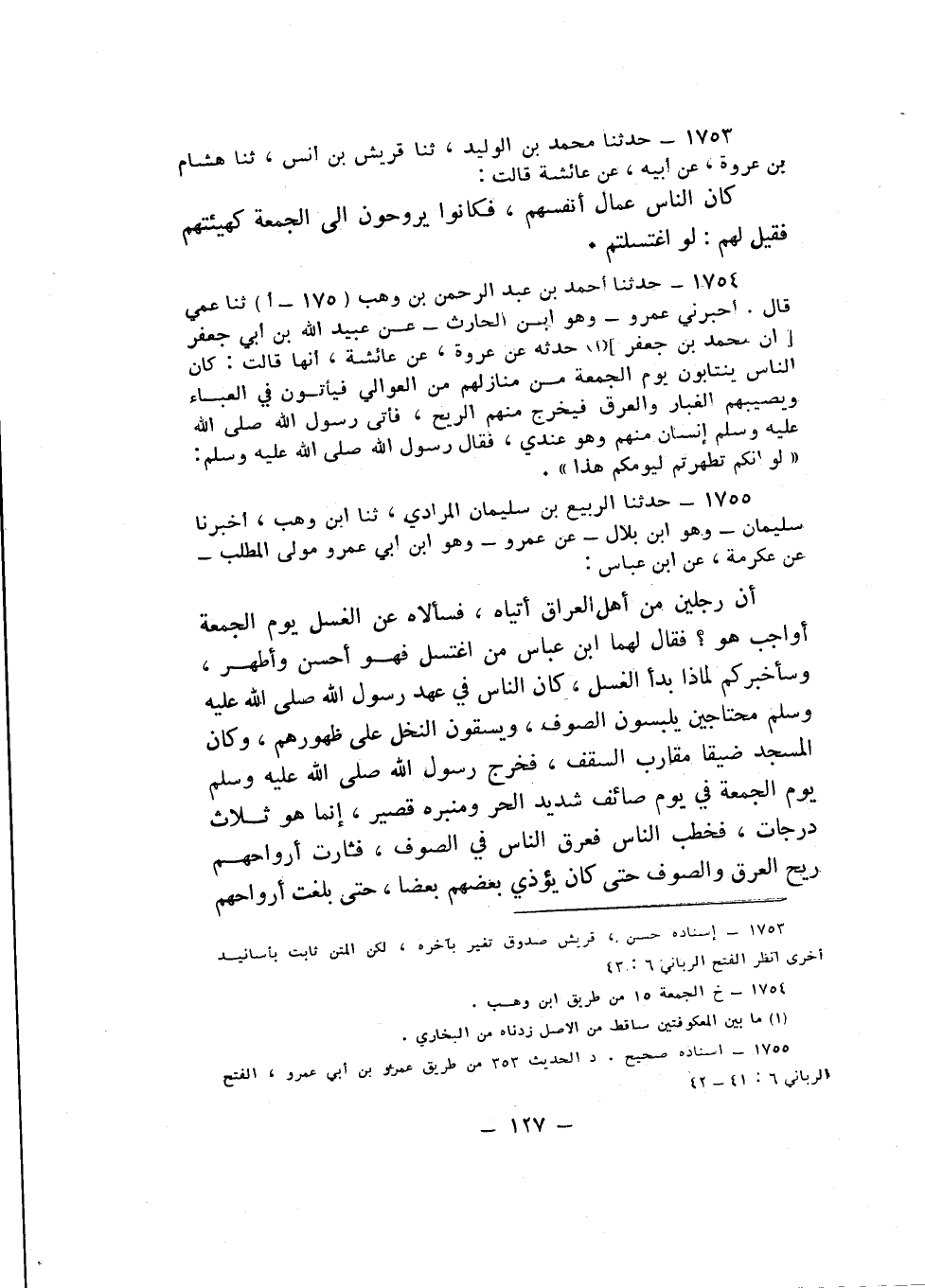 1753 - حَدَّثَنَا مُحَمَّدُ بْنُ الْوَلِيدِ، ثنا قُرَيْشُ بْنُ أَنَسٍ، ثنا هِشَامُ بْنُ عُرْوَةَ، عَنْ أَبِيهِ، عَنْ عَائِشَةَ قَالَتْ: " كَانَ §النَّاسُ عُمَّالَ أَنْفُسِهِمْ , فَكَانُوا يَرُوحُونَ إِلَى الْجُمُعَةِ كَهَيْئَتِهِمْ , فَقِيلَ لَهُمْ: لَوِ اغْتَسَلْتُمْ "K1753 - قال الأعظمي: إسناده حسن قريش صدوق تغير بآخره لكن المتن ثابت بأسانيد أخرى