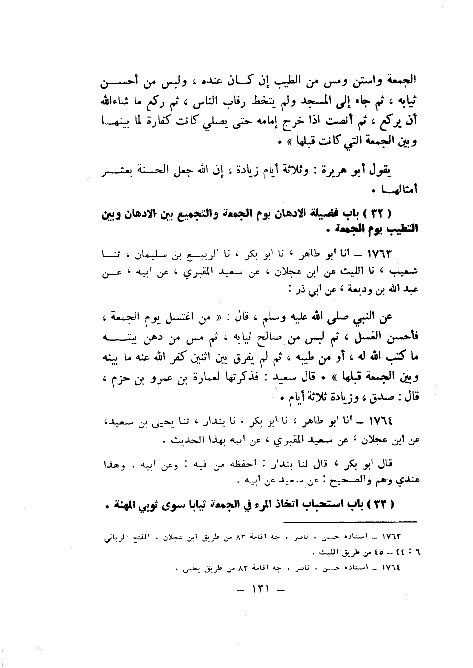 1763 - نا الرَّبِيعُ بْنُ سُلَيْمَانَ، ثنا شُعَيْبٌ، نا اللَّيْثُ، عَنِ ابْنِ عَجْلَانَ، عَنْ سَعِيدٍ الْمَقْبُرِيِّ، عَنْ أَبِيهِ، عَنْ عَبْدِ اللَّهِ بْنِ وَدِيعَةَ، عَنْ أَبِي ذَرٍّ، عَنِ النَّبِيِّ صَلَّى اللهُ عَلَيْهِ وَسَلَّمَ قَالَ: «§مَنِ اغْتَسَلَ يَوْمَ الْجُمُعَةِ فَأَحْسَنَ الْغُسْلَ , ثُمَّ لَبِسَ مِنْ صَالِحِ ثِيَابِهِ , ثُمَّ مَسَّ مِنْ دُهْنِ بَيْتِهِ مَا كَتَبَ اللَّهُ لَهُ , أَوْ مِنْ طِيبِهِ , ثُمَّ لَمْ يُفَرِّقْ بَيْنَ اثْنَيْنِ كَفَّرَ اللَّهُ عَنْهُ مَا بَيْنَهُ وَبَيْنَ الْجُمُعَةِ قَبْلَهَا» . قَالَ سَعِيدٌ: فَذَكَرْتُهَا لِعُمَارَةَ بْنِ عَمْرِو بْنِ حَزْمٍ قَالَ: صَدَقَ , وَزِيَادَةُ ثَلَاثَةِ أَيَّامٍ.K1763 - قال الألباني: إسناده حسن