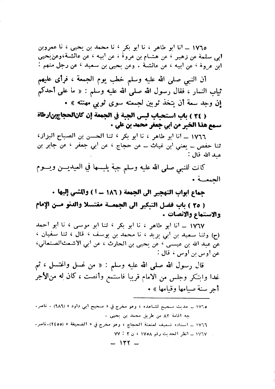 1765 - نا مُحَمَّدُ بْنُ يَحْيَى، نا عَمْرُو بْنُ أَبِي سَلَمَةَ، عَنْ زُهَيْرٍ، عَنْ هِشَامِ بْنِ عُرْوَةَ، عَنْ أَبِيهِ، عَنْ عَائِشَةَ، وَعَنْ يَحْيَى بْنِ عُرْوَةَ، عَنْ أَبِيهِ، عَنْ عَائِشَةَ، وَعَنْ يَحْيَى بْنِ سَعِيدٍ، عَنْ رَجُلٍ مِنْهُمْ، أَنَّ النَّبِيَّ صَلَّى اللهُ عَلَيْهِ وَسَلَّمَ خَطَبَ يَوْمَ الْجُمُعَةِ , فَرَأَى عَلَيْهِمْ ثِيَابَ النِّمَارِ فَقَالَ رَسُولُ اللَّهِ صَلَّى اللهُ عَلَيْهِ وَسَلَّمَ: «§مَا عَلَى أَحَدِكُمْ إِنْ وَجَدَ سَعَةً أَنْ يَتَّخِذَ ثَوْبَيْنِ لِجُمُعَتِهِ سِوَى ثَوْبَيْ مِهْنَتِهِ؟» K1765 - قال الألباني: حديث صحيح لشاهده