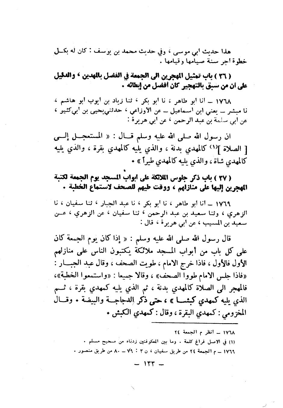 1769 - نا عَبْدُ الْجَبَّارِ، ثنا سُفْيَانُ، نا الزُّهْرِيُّ، وَثنا سَعِيدُ بْنُ عَبْدِ الرَّحْمَنِ، ثنا سُفْيَانُ، عَنِ الزُّهْرِيِّ، عَنْ سَعِيدِ بْنِ الْمُسَيِّبِ، عَنْ أَبِي هُرَيْرَةَ قَالَ: قَالَ رَسُولُ اللَّهِ صَلَّى اللهُ عَلَيْهِ وَسَلَّمَ: «§إِذَا كَانَ يَوْمُ الْجُمُعَةِ كَانَ عَلَى كُلِّ بَابٍ مِنْ أَبْوَابِ الْمَسْجِدِ مَلَائِكَةٌ يَكْتُبُونَ النَّاسَ عَلَى مَنَازِلِهِمُ الْأَوَّلَ فَالْأَوَّلَ , فَإِذَا خَرَجَ الْإِمَامُ طُوِيَتِ الصُّحُفُ» . وَقَالَ عَبْدُ الْجَبَّارِ: «فَإِذَا جَلَسَ الْإِمَامُ طَوَوَا الصُّحُفَ» . وَقَالَا جَمِيعًا: «وَاسْتَمَعُوا الْخُطْبَةَ , فَالْمُهَجِّرُ إِلَى الصَّلَاةِ كَالْمُهْدِي بَدَنَةً , ثُمَّ الَّذِي يَلِيهِ كَمُهْدِي بَقَرَةً , ثُمَّ الَّذِي يَلِيهِ كَمُهْدِي كَبْشٍ» حَتَّى ذَكَرَ الدَّجَاجَةَ وَالْبَيْضَةَ. وَقَالَ الْمَخْزُومِيُّ: «كَمُهْدِي الْبَقَرَةِ» , وَقَالَ: «كَمُهْدِي الْكَبْشِ»