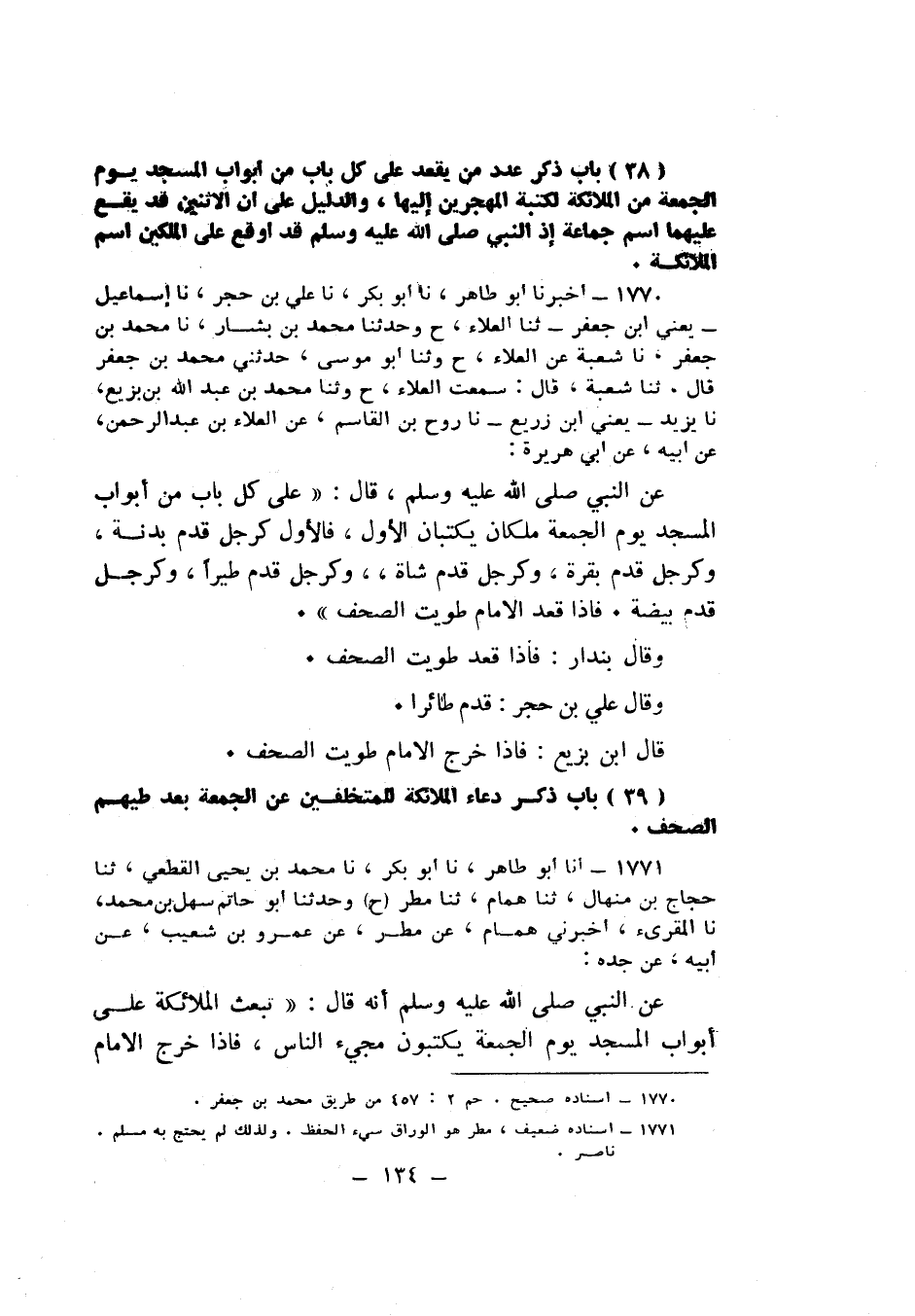 1770 - نا عَلِيُّ بْنُ حُجْرٍ، نا إِسْمَاعِيلُ يَعْنِي ابْنَ جَعْفَرٍ، ثنا الْعَلَاءُ، ح، وَحَدَّثَنَا مُحَمَّدُ بْنُ بَشَّارٍ، نا مُحَمَّدُ بْنُ جَعْفَرٍ، نا شُعْبَةُ، عَنِ الْعَلَاءِ، ح، وَثنا أَبُو مُوسَى، حَدَّثَنِي مُحَمَّدُ بْنُ جَعْفَرٍ قَالَ: ثنا شُعْبَةُ قَالَ: سَمِعْتُ الْعَلَاءَ، ح، وَثنا مُحَمَّدُ بْنُ عَبْدِ اللَّهِ بْنِ بَزِيعٍ، نا يَزِيدُ يَعْنِي ابْنَ زُرَيْعٍ، نا رَوْحُ بْنُ الْقَاسِمِ، عَنِ الْعَلَاءِ بْنِ عَبْدِ الرَّحْمَنِ، عَنْ أَبِيهِ، عَنْ أَبِي هُرَيْرَةَ، عَنِ النَّبِيِّ صَلَّى اللهُ عَلَيْهِ وَسَلَّمَ قَالَ: «§عَلَى كُلِّ بَابٍ مِنْ أَبْوَابِ الْمَسْجِدِ يَوْمَ الْجُمُعَةِ مَلَكَانِ يَكْتُبَانِ الْأَوَّلَ فَالْأَوَّلَ , كَرَجُلٍ قَدَّمَ بَدَنَةً , وَكَرَجُلٍ قَدَّمَ بَقَرَةً , وَكَرَجُلٍ قَدَّمَ شَاةً , وَكَرَجُلٍ قَدَّمَ طَيْرًا , وَكَرَجُلٍ قَدَّمَ بَيْضَةً , فَإِذَا قَعَدَ الْإِمَامُ طُوِيَتِ الصُّحُفُ» . وَقَالَ بُنْدَارٌ: «فَإِذَا قَعَدَ طُوِيَتِ الصُّحُفُ» . وَقَالَ عَلِيُّ بْنُ حُجْرٍ: «قَدَّمَ طَائِرًا» . قَالَ ابْنُ بَزِيعٍ: «فَإِذَا خَرَجَ الْإِمَامُ طُوِيَتِ الصُّحُفُ» K1770 - قال الأعظمي: إسناده صحيح